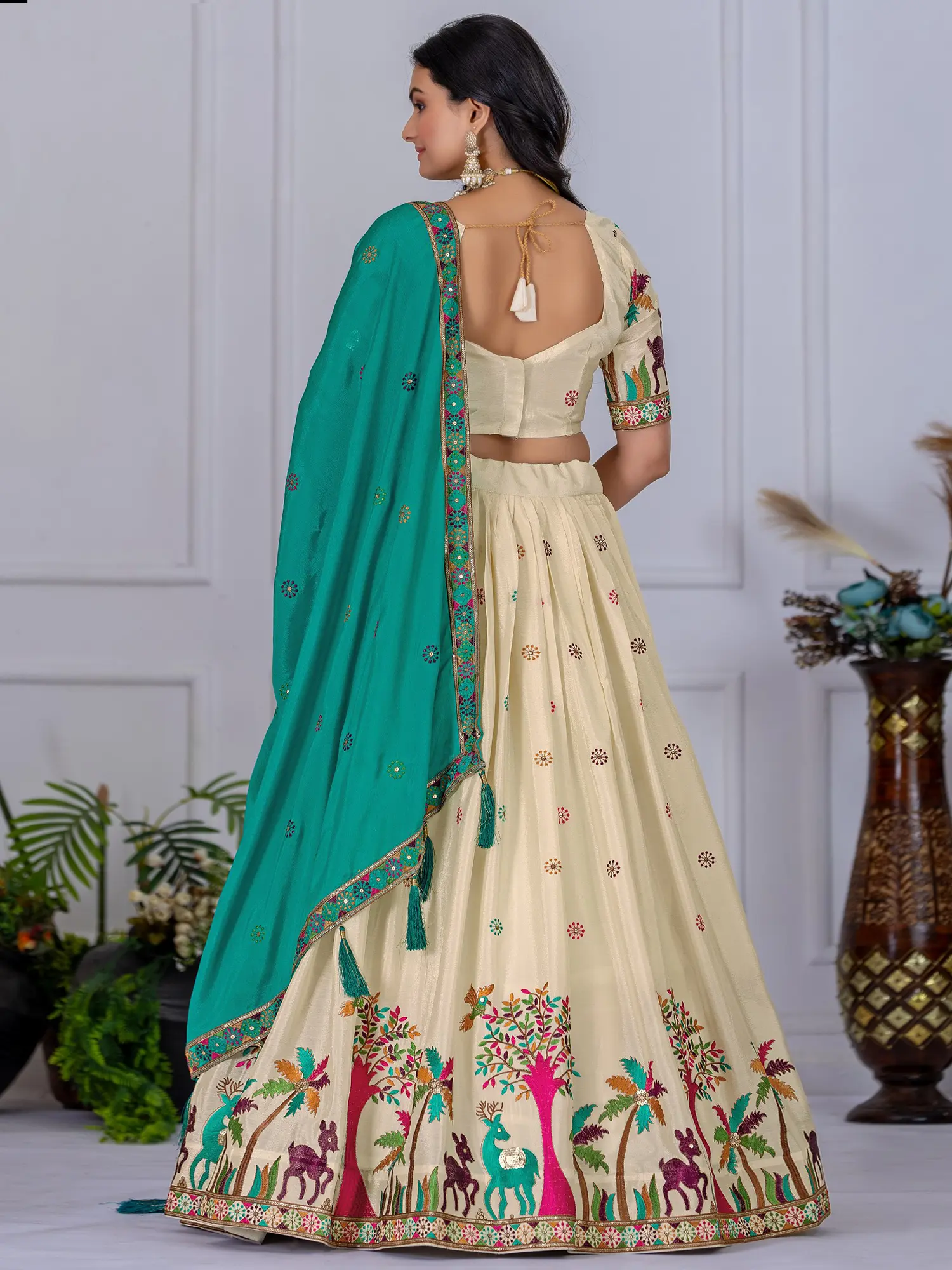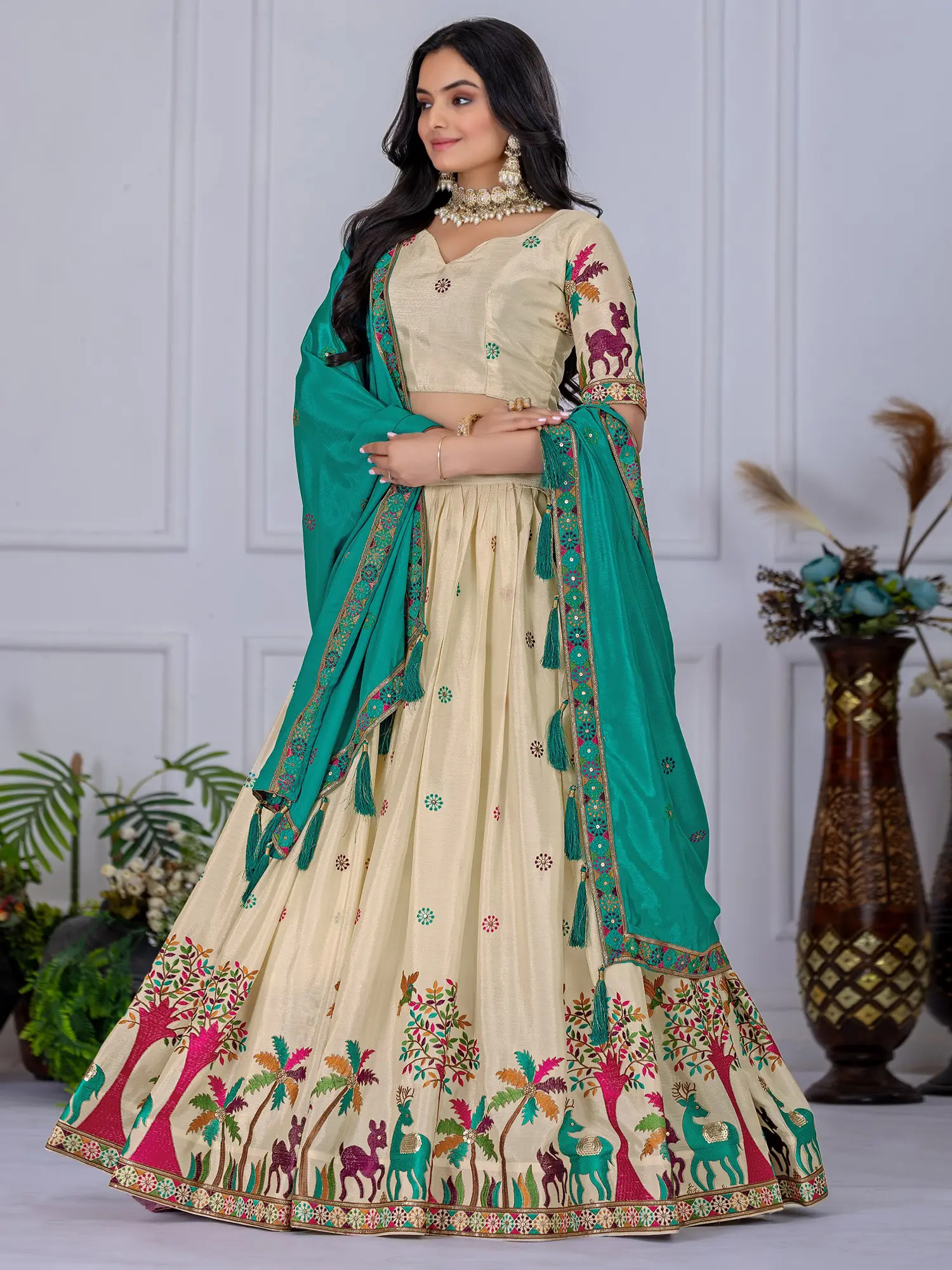 Teal Taffeta Silk Beautiful Floral Zari Embroidery Lehenga Choli with Beige Sheer Dupatta