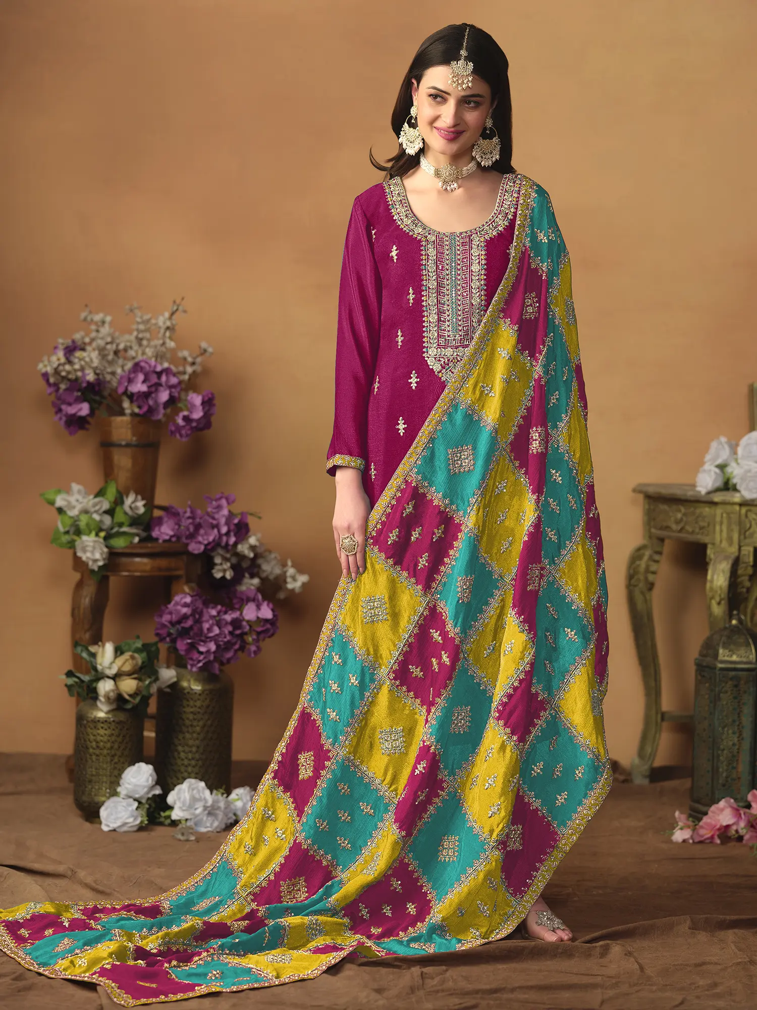 The pant style salwar promises comfort and chic appeal. The start of the ensemble is the designer multicolor dupatta, inspired by the ethnic patchwork odhni, to give you a touch of classic Indian fashion.