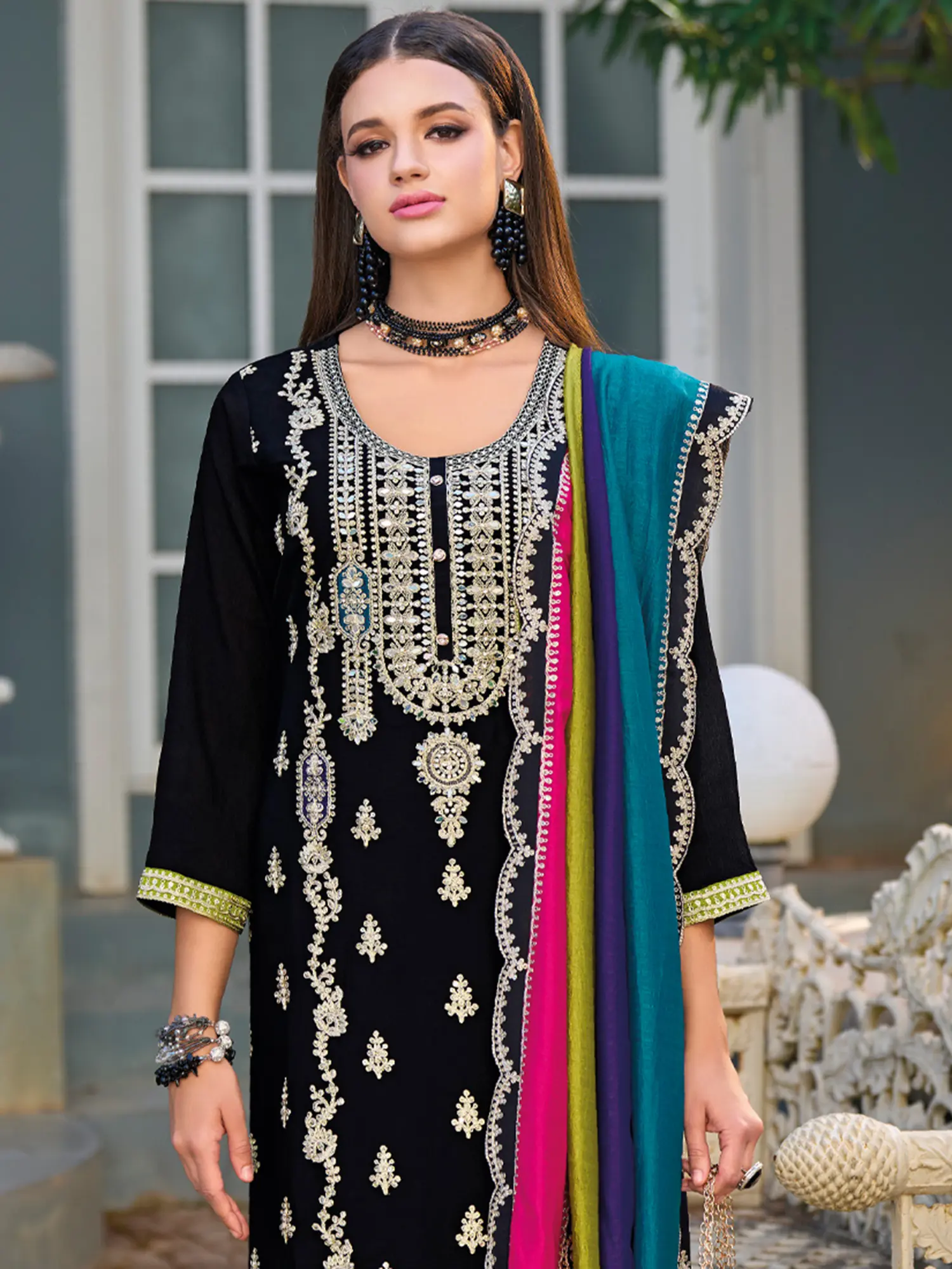 Straight Salwar Suit Set with Intricate Chain Stitch Embroidery