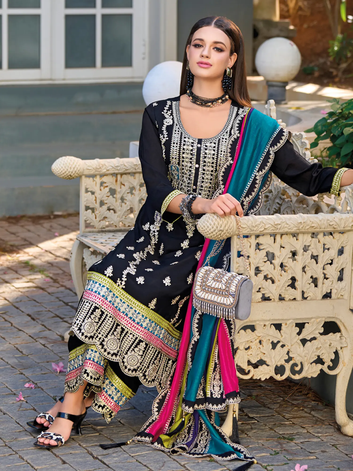 This ensemble draws inspiration from a rich tapestry of cultural heritage, reflecting the grandeur and artistry of traditional Indian ethnic wear. The intricate embroidery techniques, passed down through generations, are a celebration of enduring craftsmanship and a link to a storied past. Wearing this set allows you to connect with and embody this timeless tradition, bringing a piece of its history into your modern wardrobe.