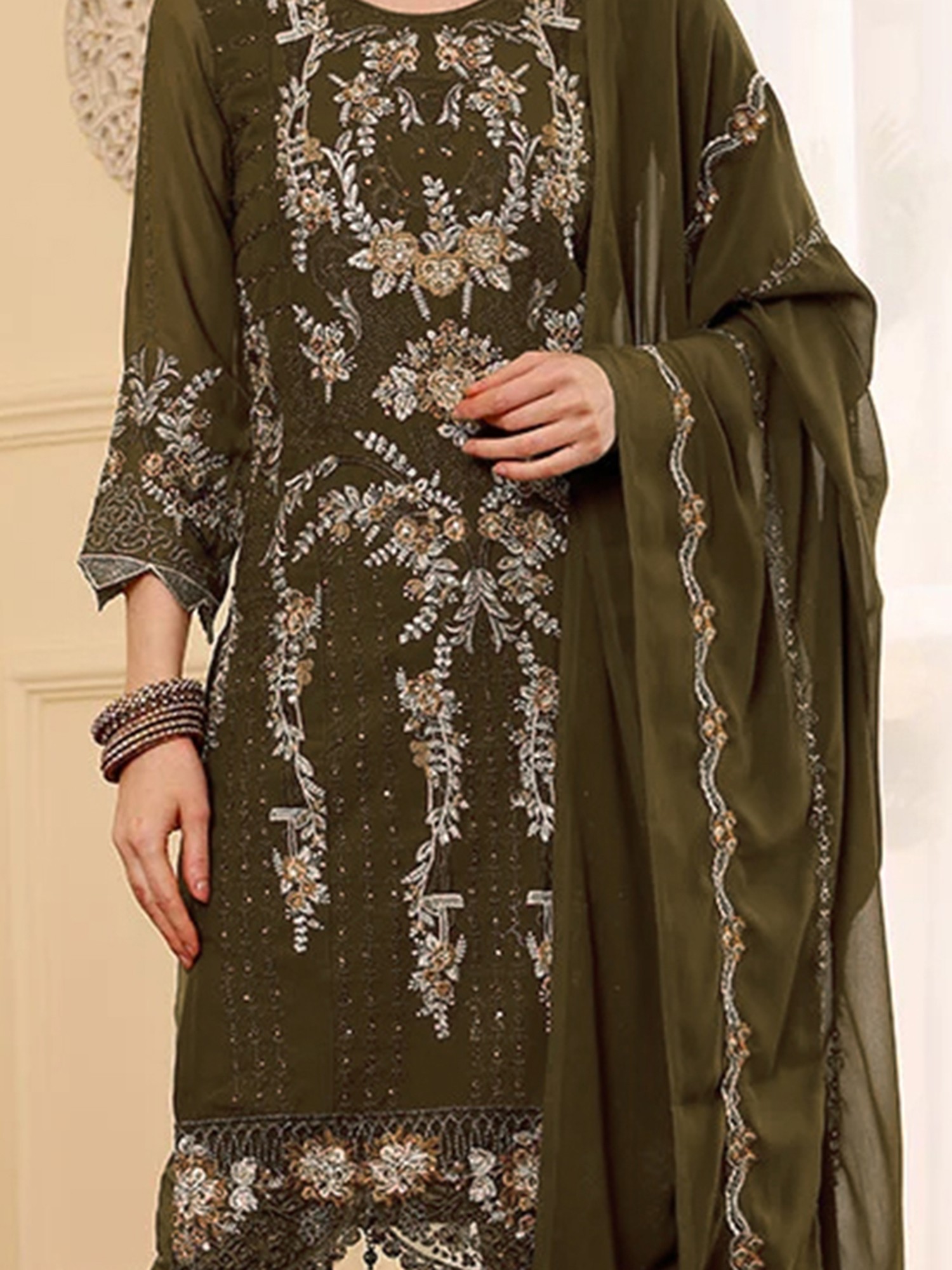 Step into a realm of sophisticated charm with this exquisite olive green salwar suit, meticulously designed for those who appreciate timeless elegance and contemporary style. Crafted from luxurious faux georgette, the kameez drapes beautifully, offering a flattering silhouette that moves with grace. The rich olive hue serves as a perfect canvas for the intricate embroidery that adorns the garment.