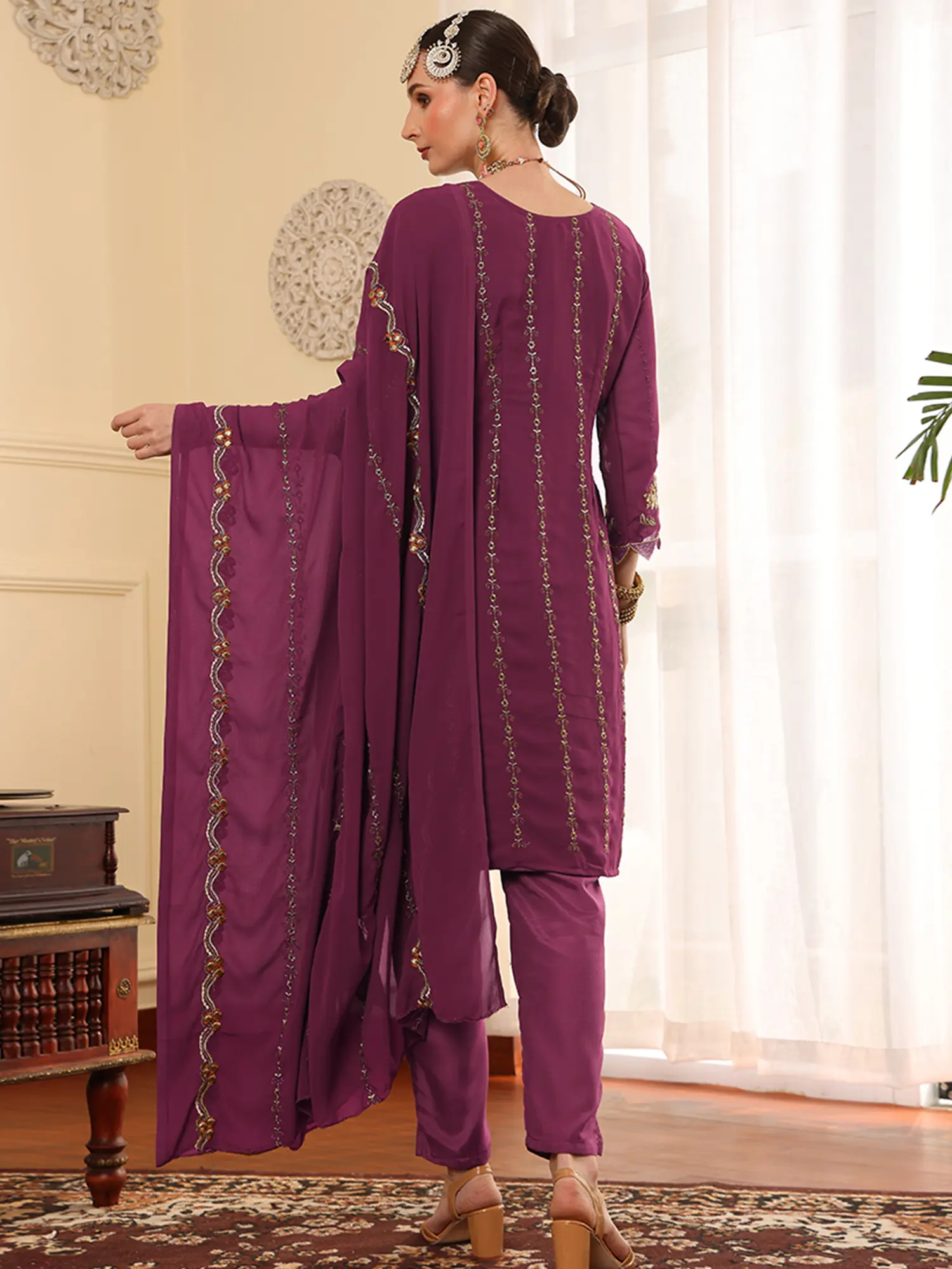 Embroidered Faux Georgette Salwar Suit Set With Santoon Bottom And Chiffon Dupatta For Women Ethnic Wear