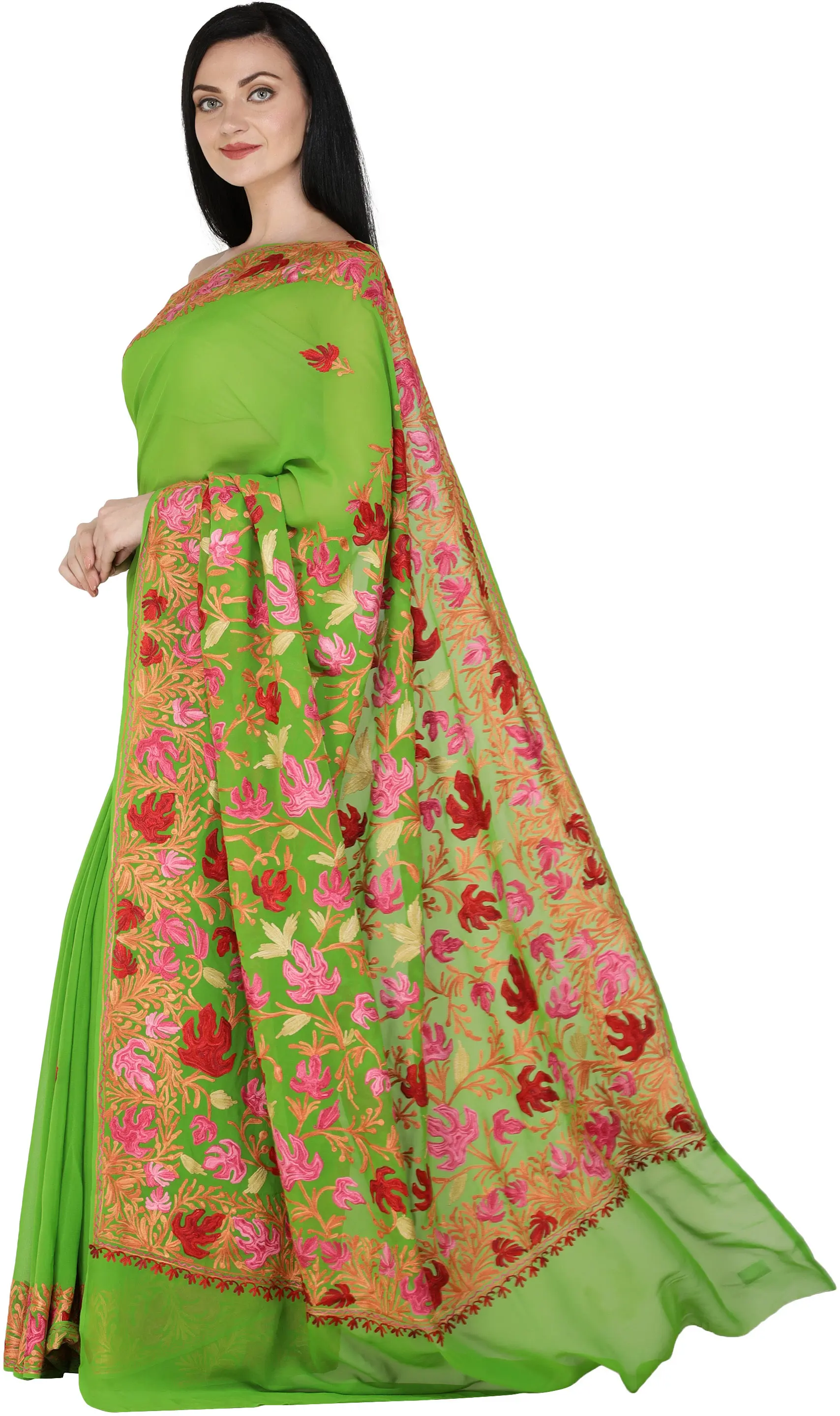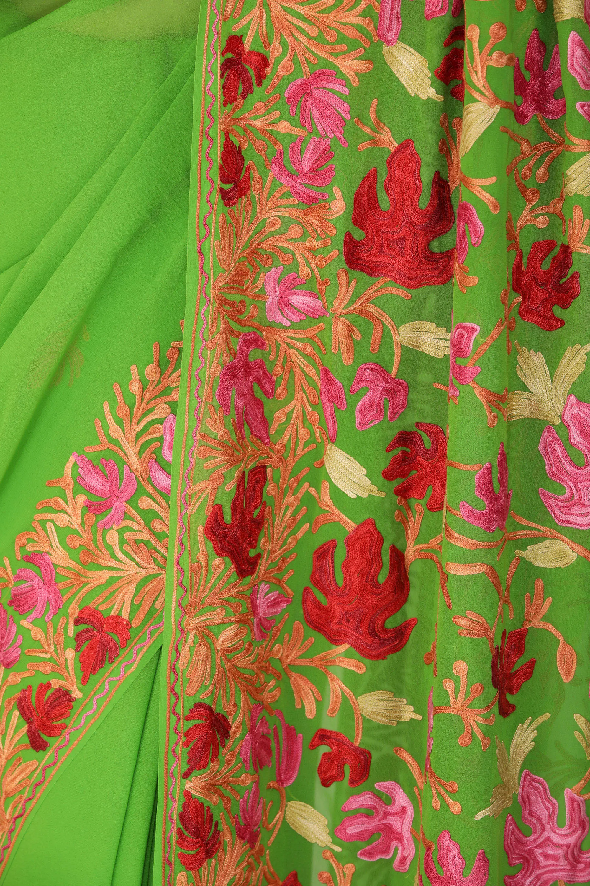 Step into a world of enchantment with this breathtaking georgette sari, a true testament to the artisanal heritage of Kashmir. The vibrant, almost luminous green hue evokes the lush landscapes and the fresh bloom of spring, making it a perfect choice for any occasion where you wish to stand out with elegance and grace. Crafted from the finest georgette, the fabric drapes beautifully, offering a light and airy feel that moves with you, creating a captivating silhouette.