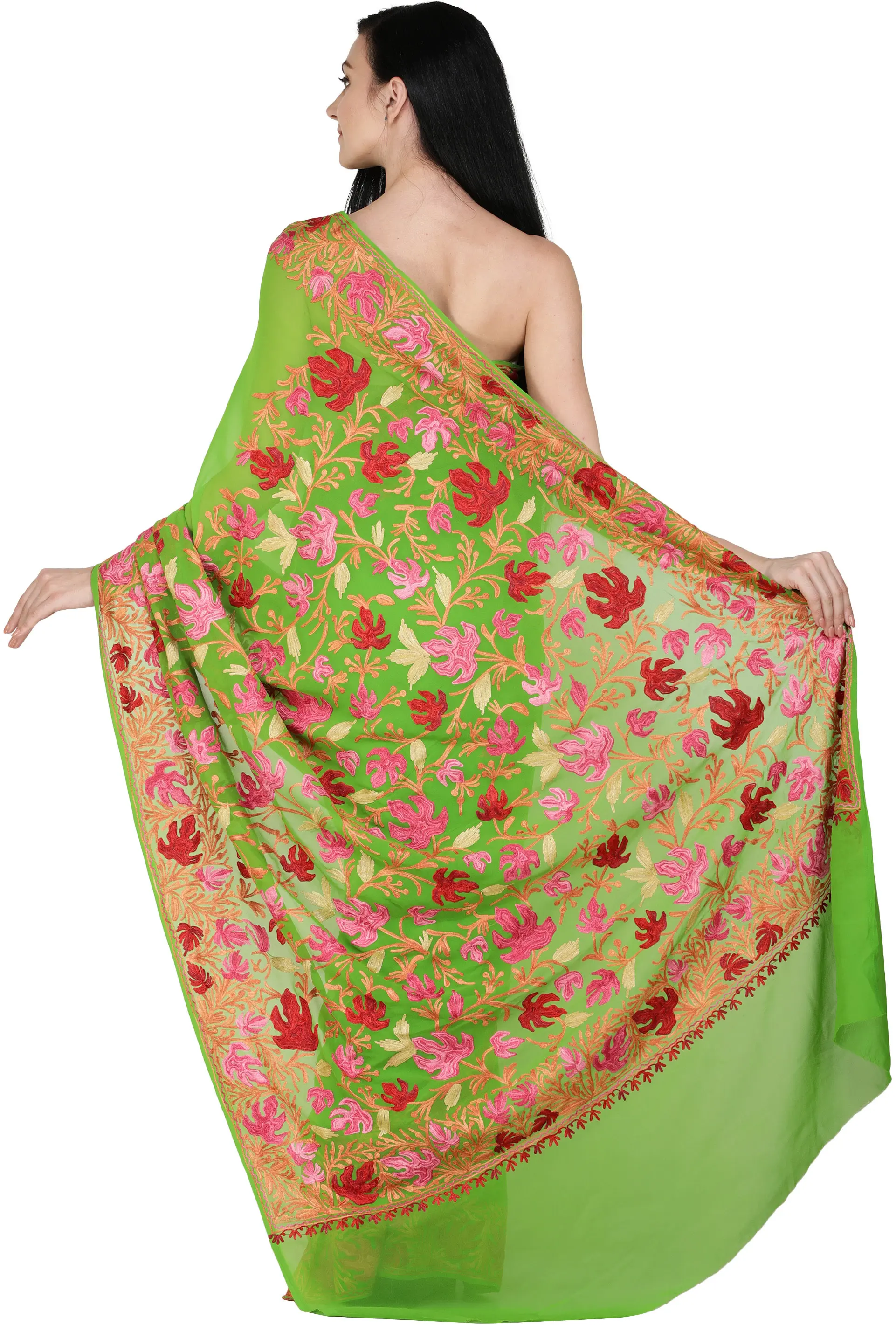 Classic-Green Sari from Kashmir with Aari Embroidered Chinar Leaves All-Over