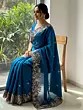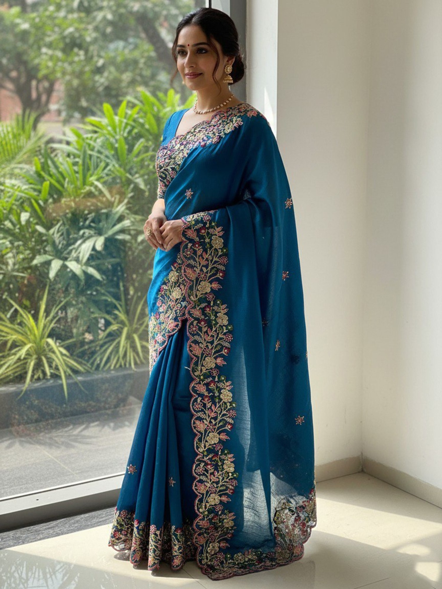 The fabric’s inherent sheen beautifully complements the vibrant, multi-hued embroidery that dances across its expanse, punctuated by subtle floral motifs scattered like stardust. You’ll appreciate the way the cutwork border introduces a captivating dimension, framing the opulent patterns with refined artistry. Accompanying this magnificent drape is a Banglori blouse, designed to be tailor-made to your specific measurements, ensuring a flawless fit that enhances your silhouette.