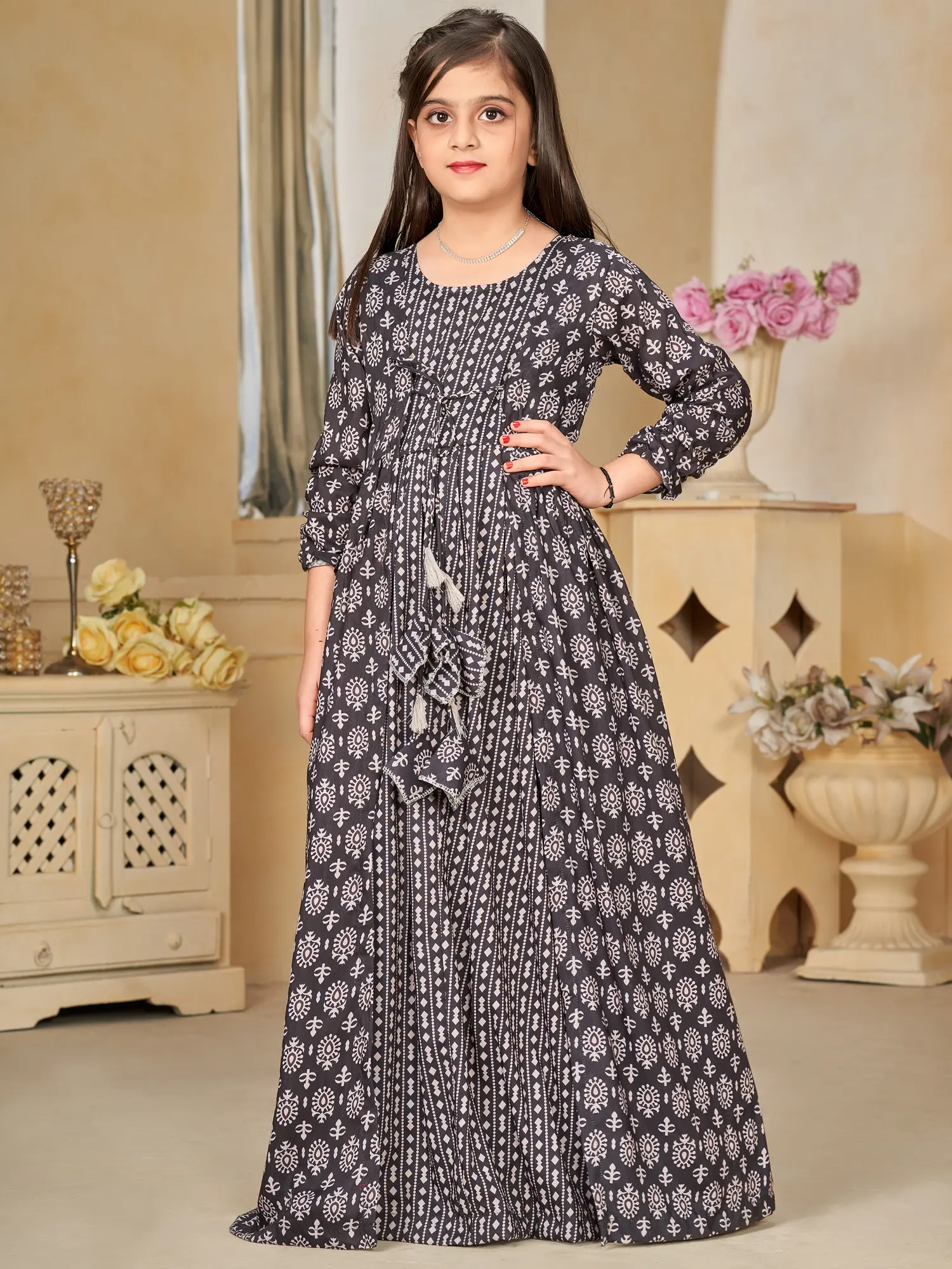 Introduce your kid to the charm and comfort of ethnic Indian wear with this beautiful Indo-Western suit set. Made with Muslin that brings gentle comfort to the ensemble, the suit features lovely ethnic prints all over. The set comes with a shrug, that offers a stylish layer that can be added or removed as per the little one’s choice.