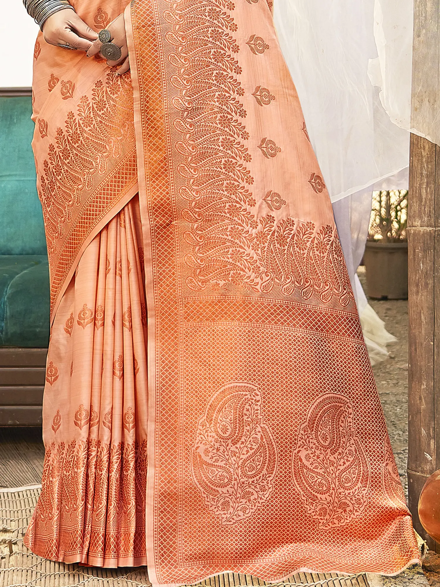 Experience the timeless allure of this meticulously crafted saree, a testament to the rich heritage of traditional weaving. This beautiful creation embodies sophistication and grace, designed to make a lasting impression at any special occasion. The luxurious silk fabric drapes beautifully, offering a comfortable and flattering fit that accentuates your natural elegance. The saree showcases intricate weaving work that reflects the skill and dedication of the artisans who brought it to life. The design is a celebration of classic motifs, arranged in a way that is both timeless and contemporary. The texture of the silk enhances the visual appeal, creating a captivating interplay of light and shadow with every movement. The attention to detail is evident in every thread, making this saree a true work of art.