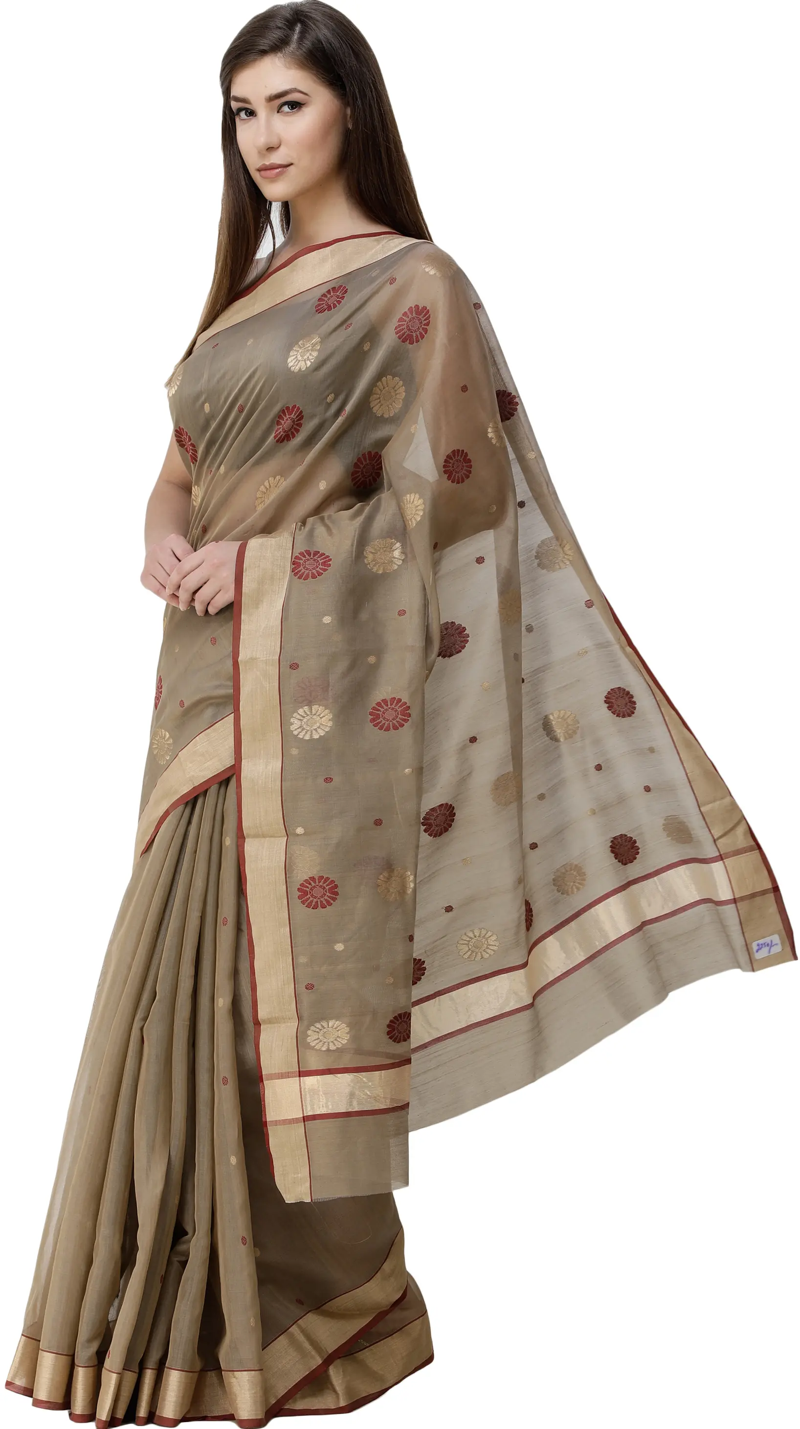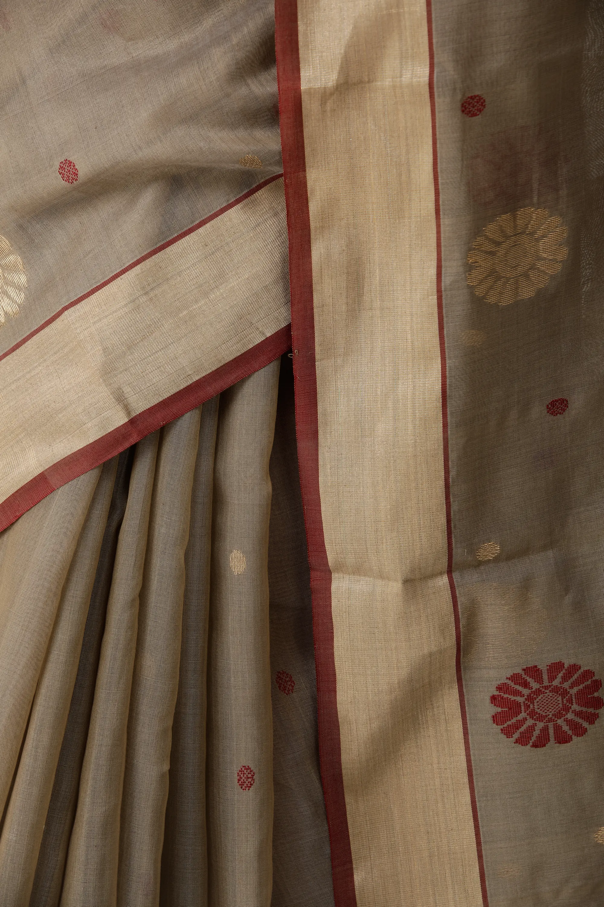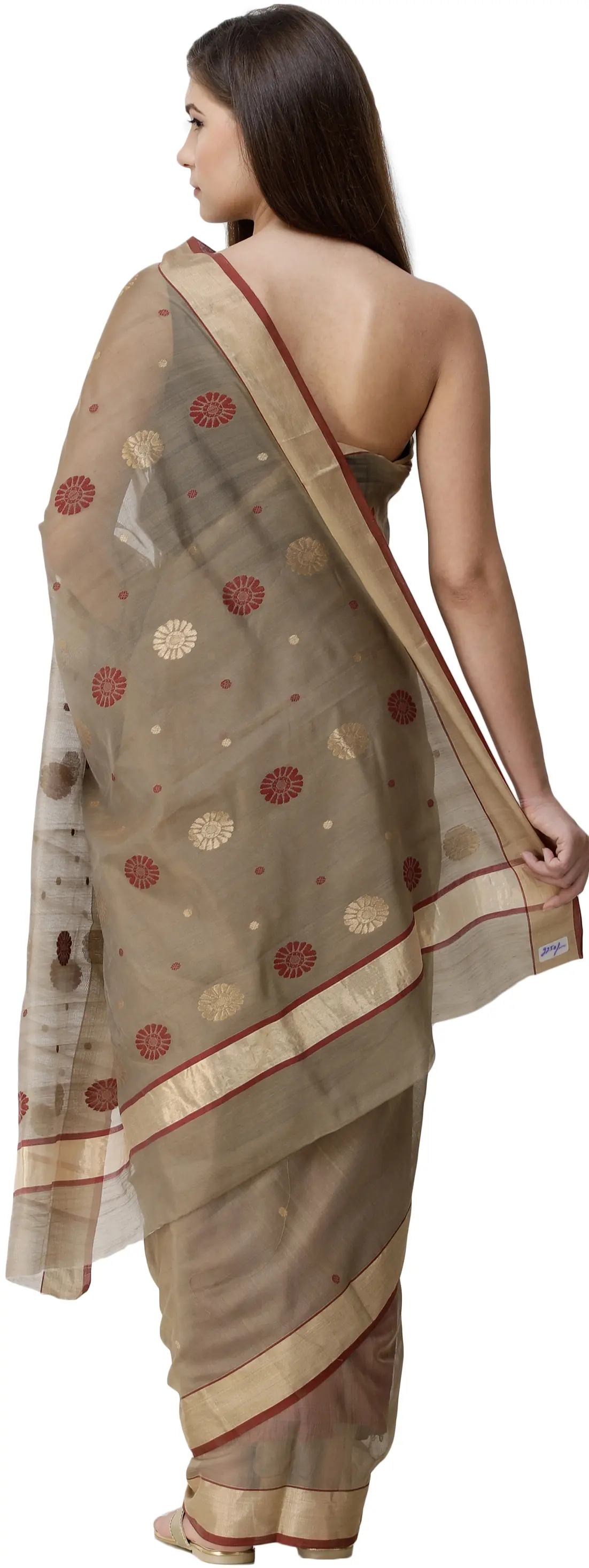 The colour of dark ochre earth adds to the gravity of the statement this saree makes. The same is complemented by a border of pale gold zariwork, finished by a piping of dark red. In keeping with the mood of this number, minimalistic booties grace the field of this saree. Simplistic red and gold flowers across the field and endpiece, and miniscule ones down the pleats. Team this with some simple gold pieces for an understated elegance.