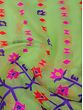 The pallu showcases a rich floral weave that is inspired by the traditional floral mesh or Jangla pattern, symbolic of virtues of abundance and lushness in life.