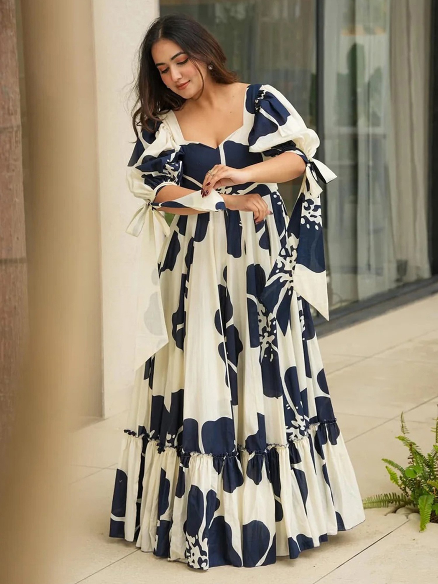 French Grey Cotton Silk Digital Print Gown With Bottom & Cotton Duppatta