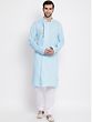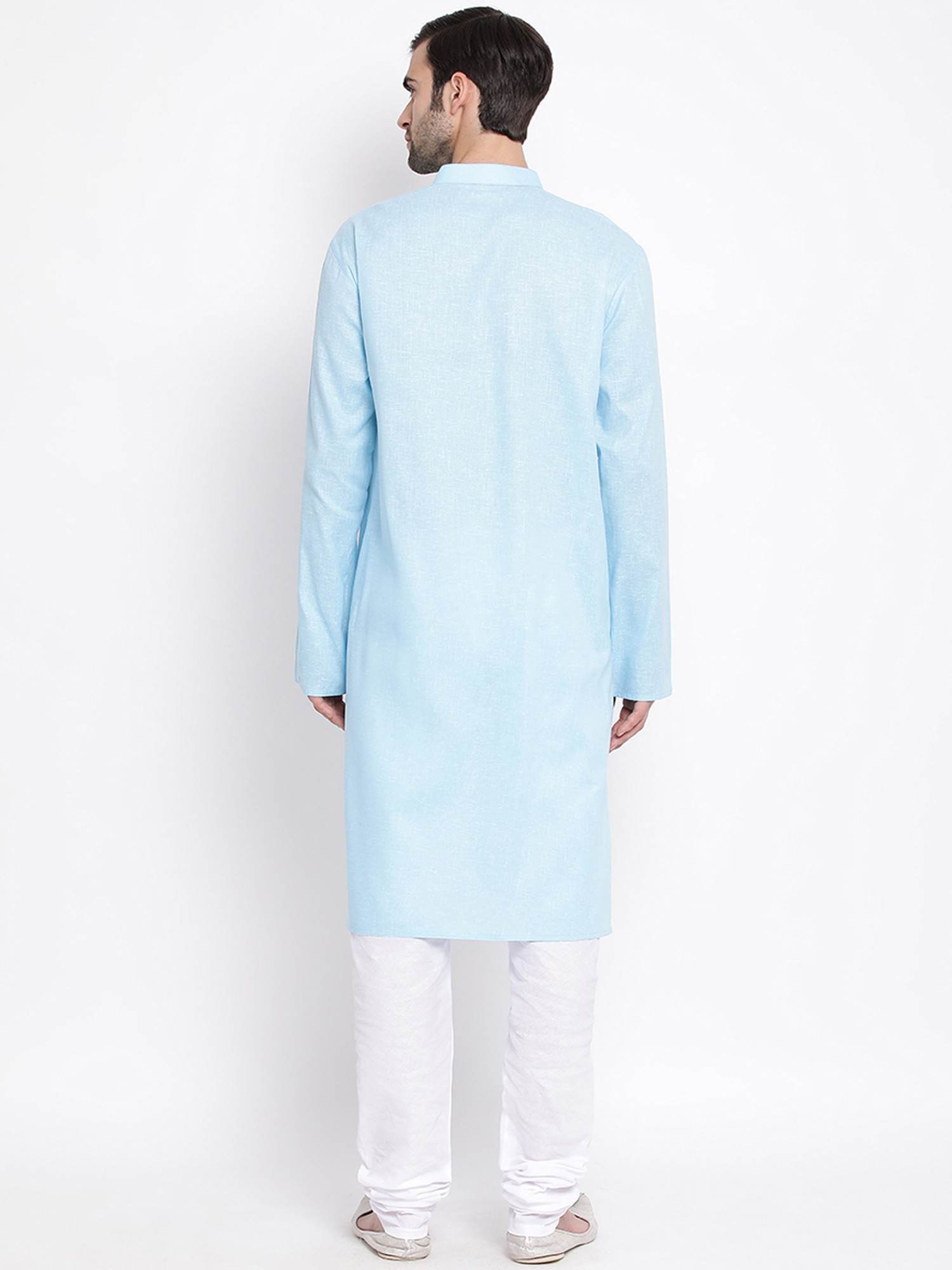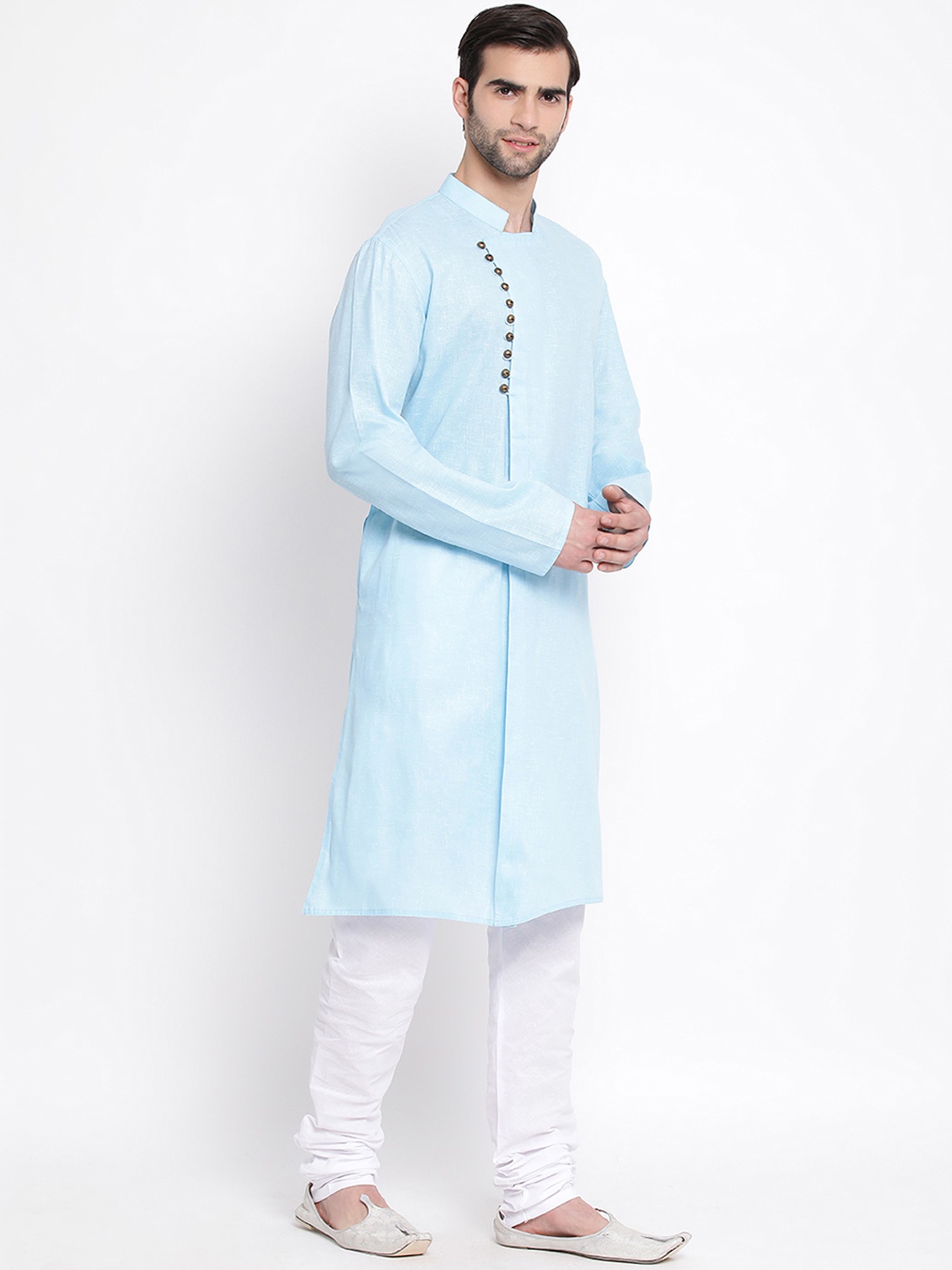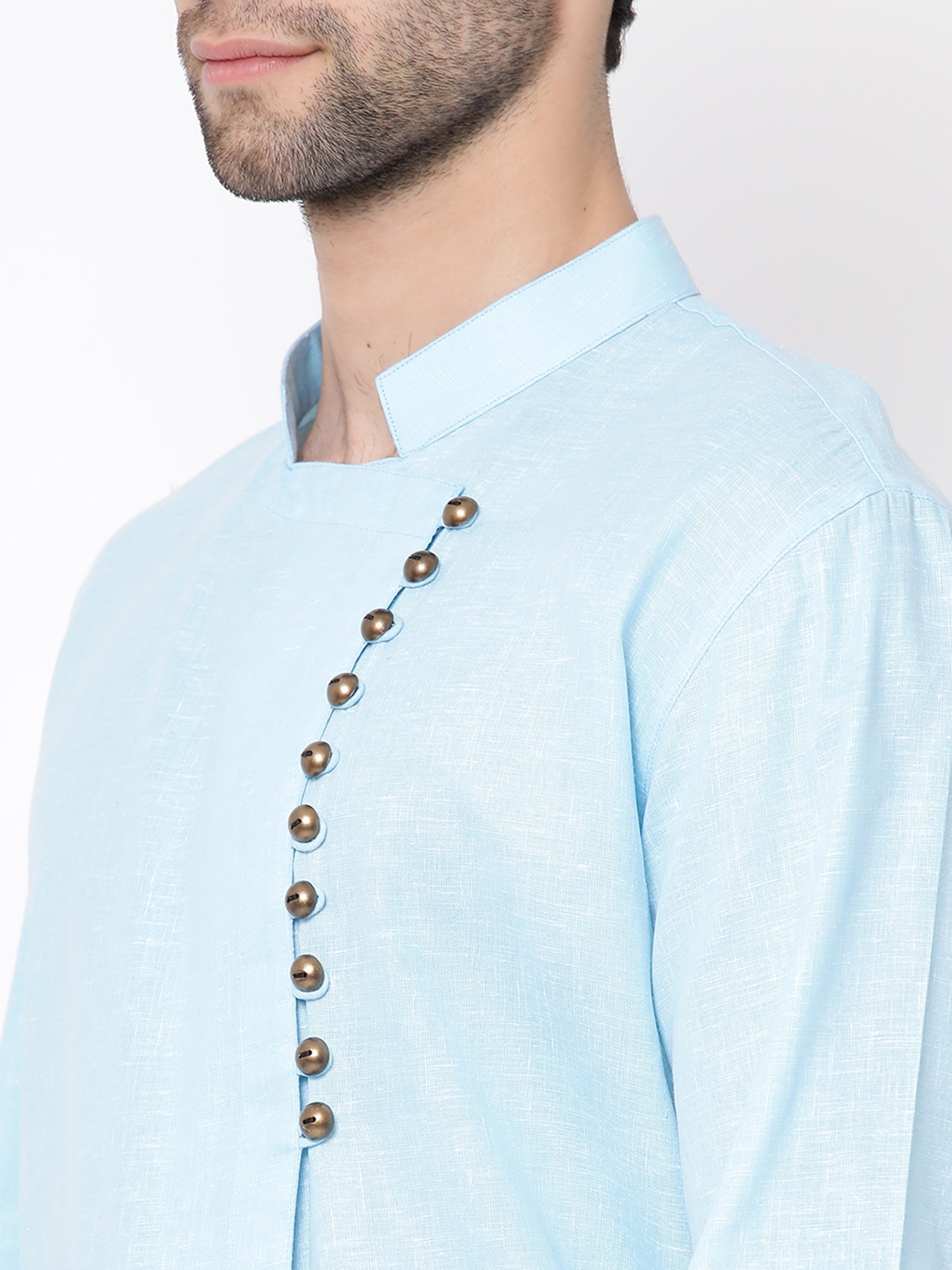Long Kurtas are an essential part of Indian ethnic menswear. There have been experiments with the style of Kurtas, but the long length of the Kurtas is a prerequisite for traditional attire. This Cotton Blend Angrakha Style Straight Kurta paired seamlessly with a White Pure Cotton Pajama is one such time of essential Indian ethnic menswear. The kurta, crafted from a premium cotton blend, features an enchanting Angrakha style that exudes traditional charm. The buttons are placed in a very stylish manner to the side of the Kurta. The straight silhouette adds a modern touch, ensuring a timeless yet contemporary look. Paired with the pristine white pure cotton pajamas, it creates a perfect harmony of comfort and style.
