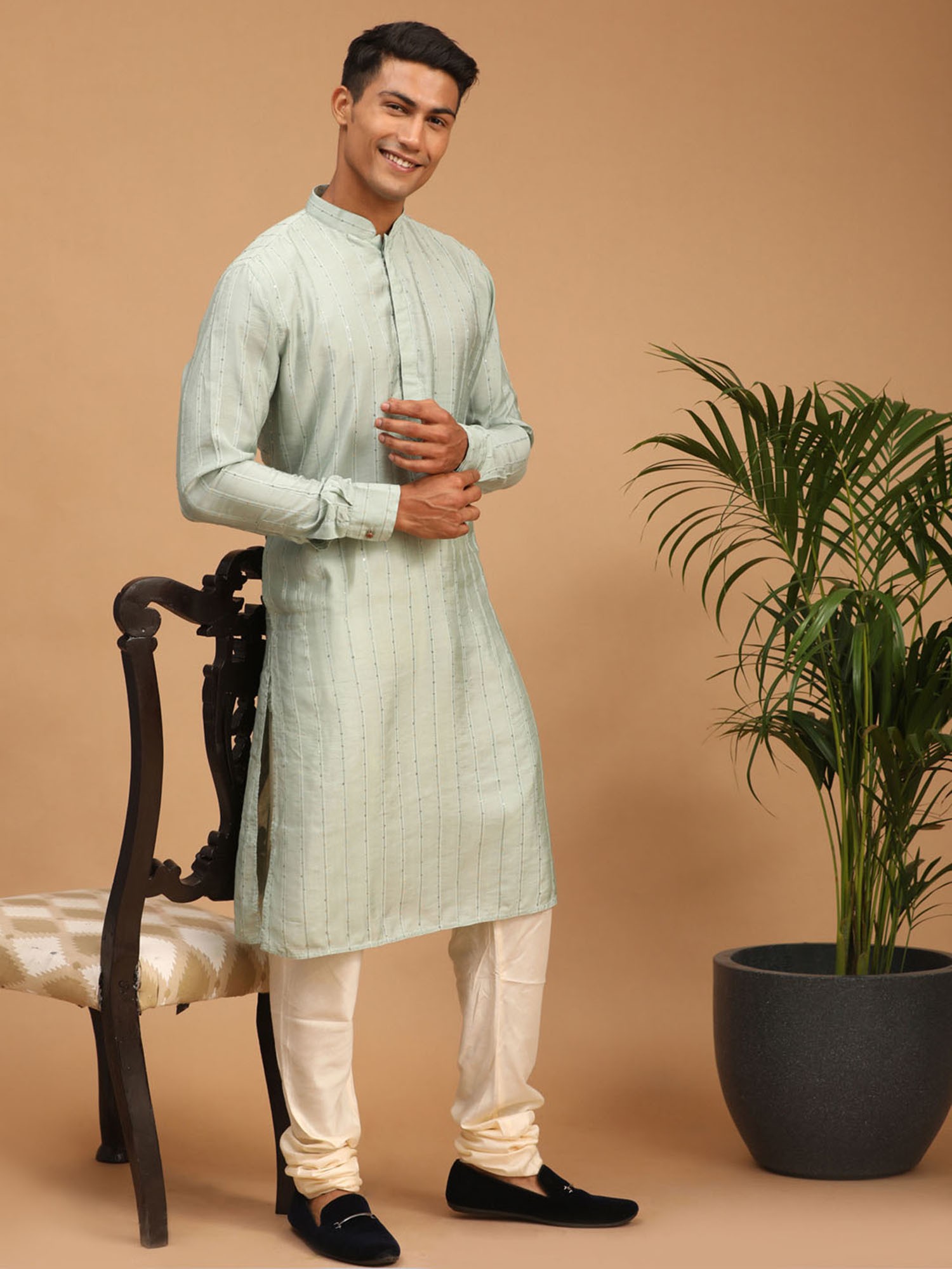 Crafted with elegance and finesse, this royal Kurta-Pajama is a sartorial masterpiece. This ensemble seamlessly marries traditional charm with contemporary flair. The cotton blend fabric exudes comfort, making it perfect for any occasion. Its intricate pencil stripe pattern adds a touch of sophistication, while the shimmering sequin work imbues a hint of opulence. As you drape yourself in this mesmerising Kurta-Pajama, you will embody enchanting style and grace. With this ensemble, you will effortlessly captivate hearts and turn heads, making it a must-have for those who appreciate the fusion of tradition and modernity.