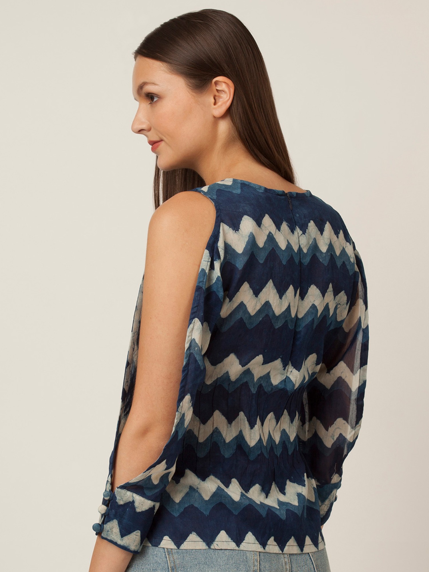Cold shoulders are not cold. They are the hottest trend in shirts and blouses. They are specifically shaped arms with a longitudinal incision in the cloth that lies on the upper edge of the top. This Cotton Cold Shoulder Printed and Back Pintuck Top uses the warm charm of the cold shoulder style and the pintuck to enhance its look. The back pintuck detailing adds a touch of sophistication, elevating the overall style. Made from comfortable cotton, this top seamlessly combines fashion and ease. Perfect for casual outings, it's a versatile choice that effortlessly blends comfort with a contemporary edge.