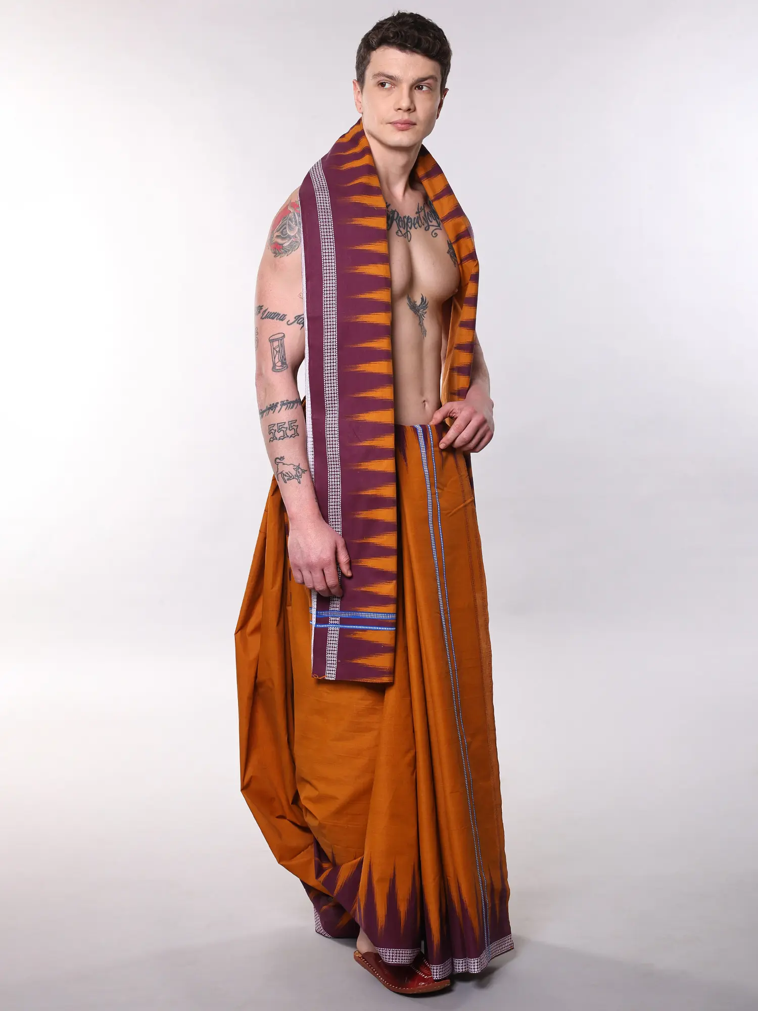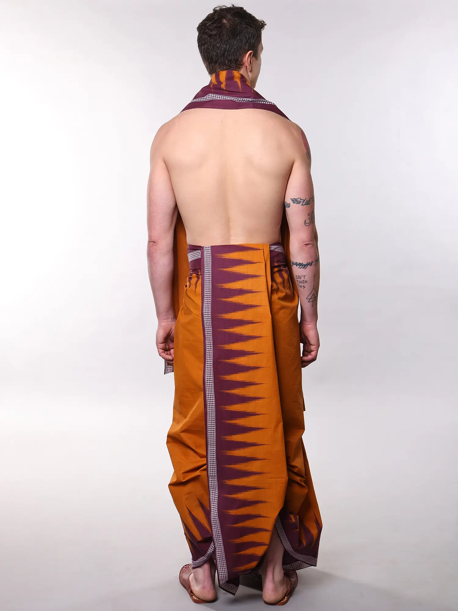 You'll appreciate the generous dimensions that allow for graceful draping, providing both comfort and a majestic silhouette. The dhoti, measuring a substantial 192 inches in length and 46 inches in width, offers unparalleled freedom of movement and can be styled in myriad ways to suit your preference. Complementing this, the angavastram, at 85 inches long and 46 inches wide, is perfectly proportioned to be worn with effortless poise, its striking border acting as a subtle yet captivating focal point.