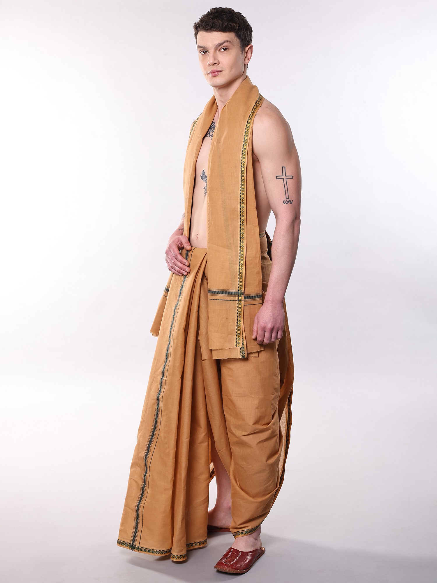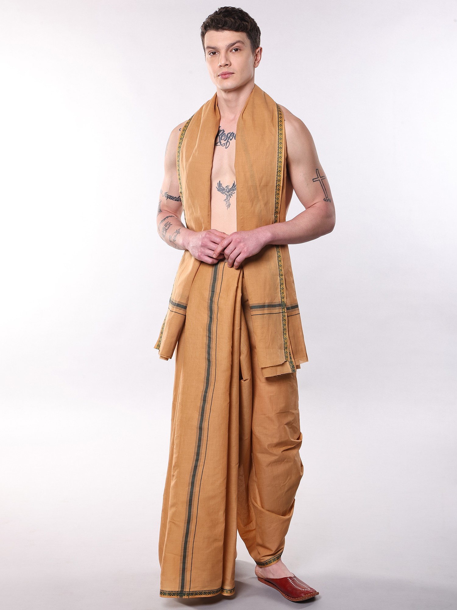 This Dhoti and Angavastram set seamlessly blends tradition with contemporary style. Whether you're attending a wedding, participating in a puja, or celebrating a festival, this ensemble will help you make a statement. Its understated elegance and cultural significance make it a versatile choice for any occasion. Embrace the heritage, embrace the style, and make a lasting impression with this timeless classic.