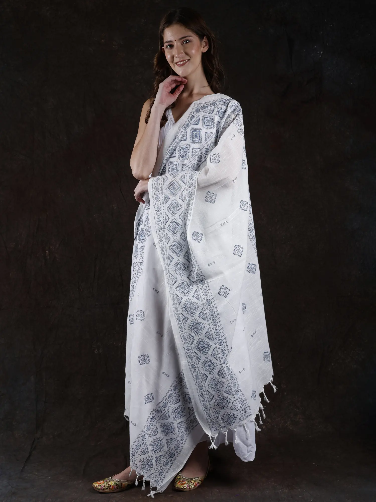 The comforting luxury of cotton becomes timeless with this beautiful printed dupatta from Telangana. The soft and elegant fabric is beautified with ethnic motifs spread all over the body of the dupatta, giving it a sophisticated and traditional look.