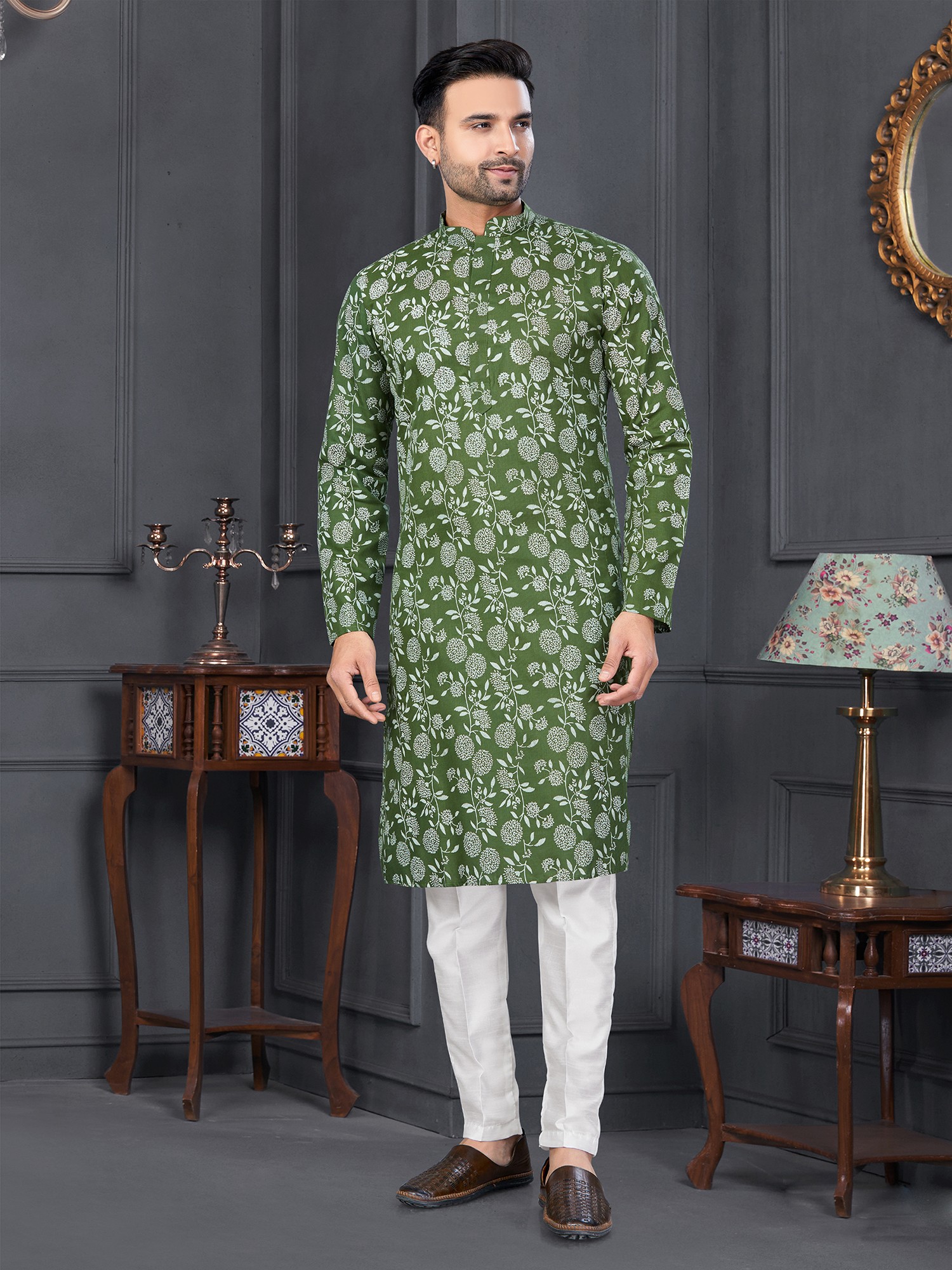 This kurta features a classic mandarin collar, adding a touch of refined elegance to the overall design. The all-over floral print creates a visually appealing texture, making it a standout piece in your wardrobe. The straight pajama complements the kurta perfectly, providing a clean and modern silhouette. The combination of the print and the solid color pajama creates a balanced look that's both eye-catching and versatile. The full sleeves provide coverage and make it suitable for various weather conditions. This kurta pajama set is designed to make you look and feel your best, effortlessly.