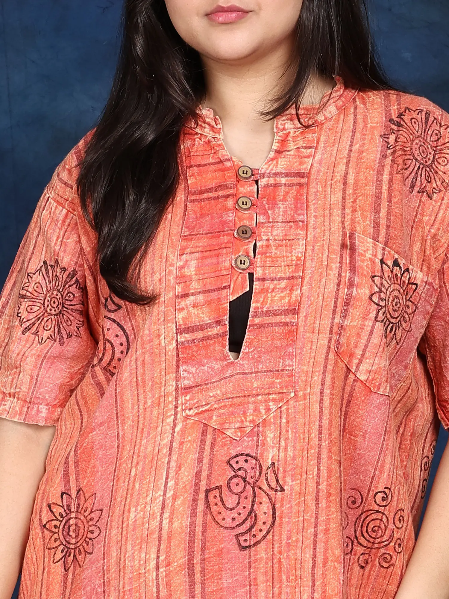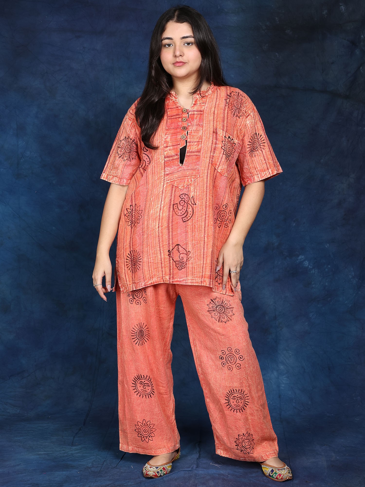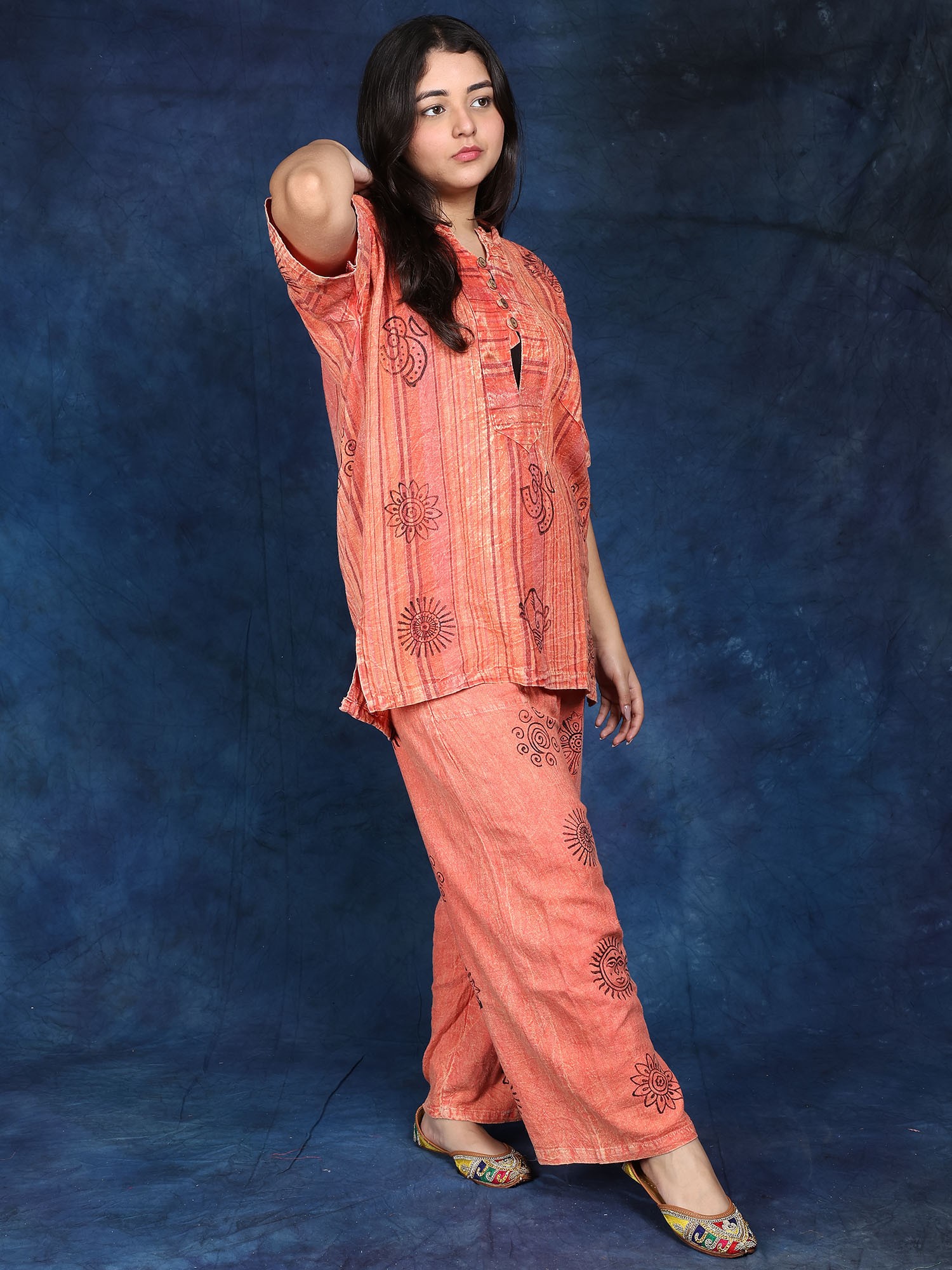 River-Blue Kaftan Style Pure Cotton Co-Ord Set with Printed Flowers