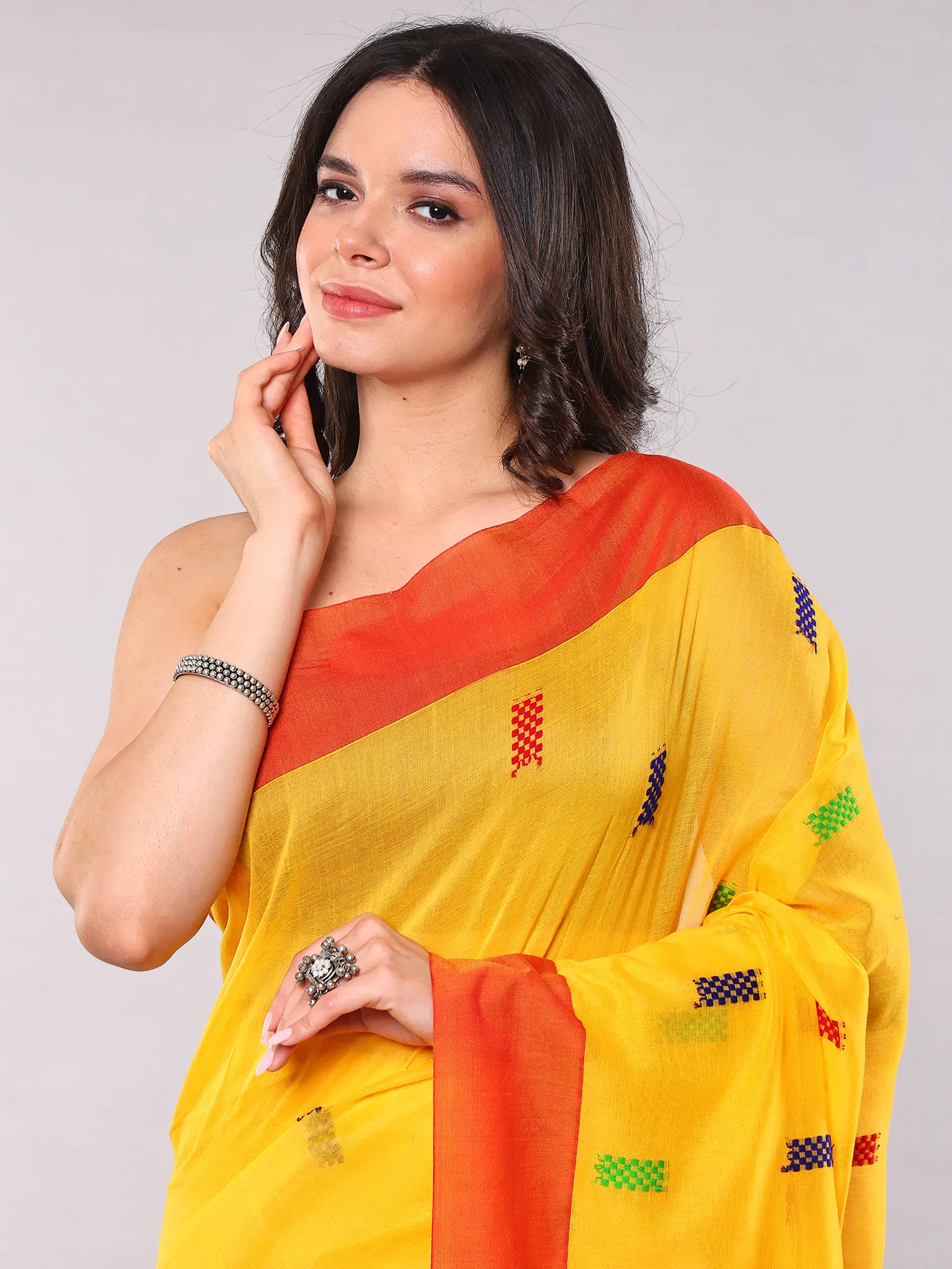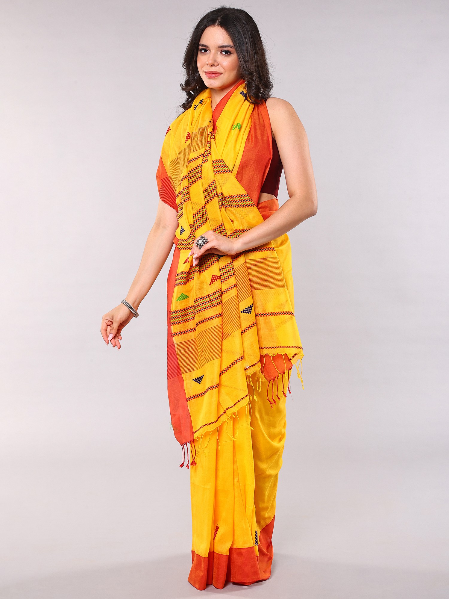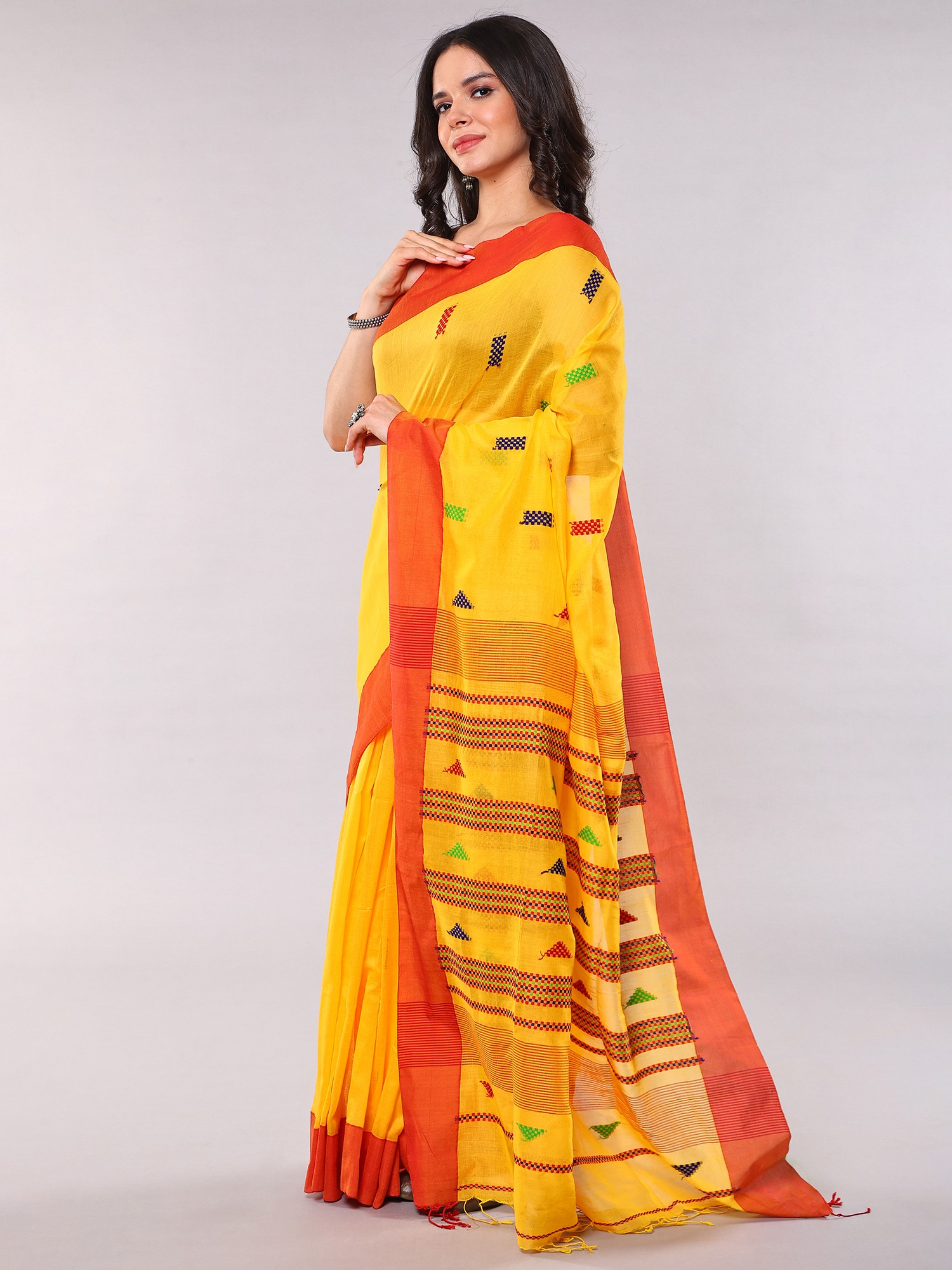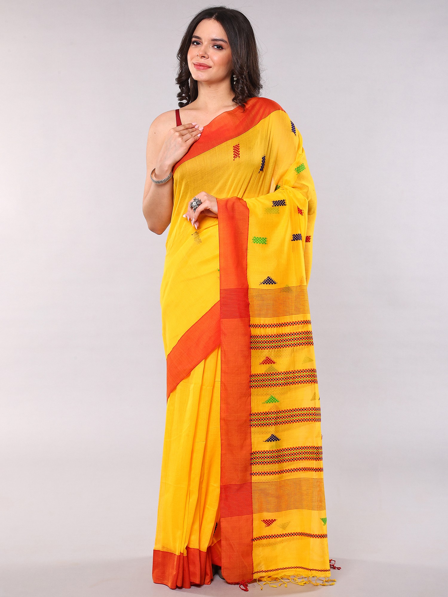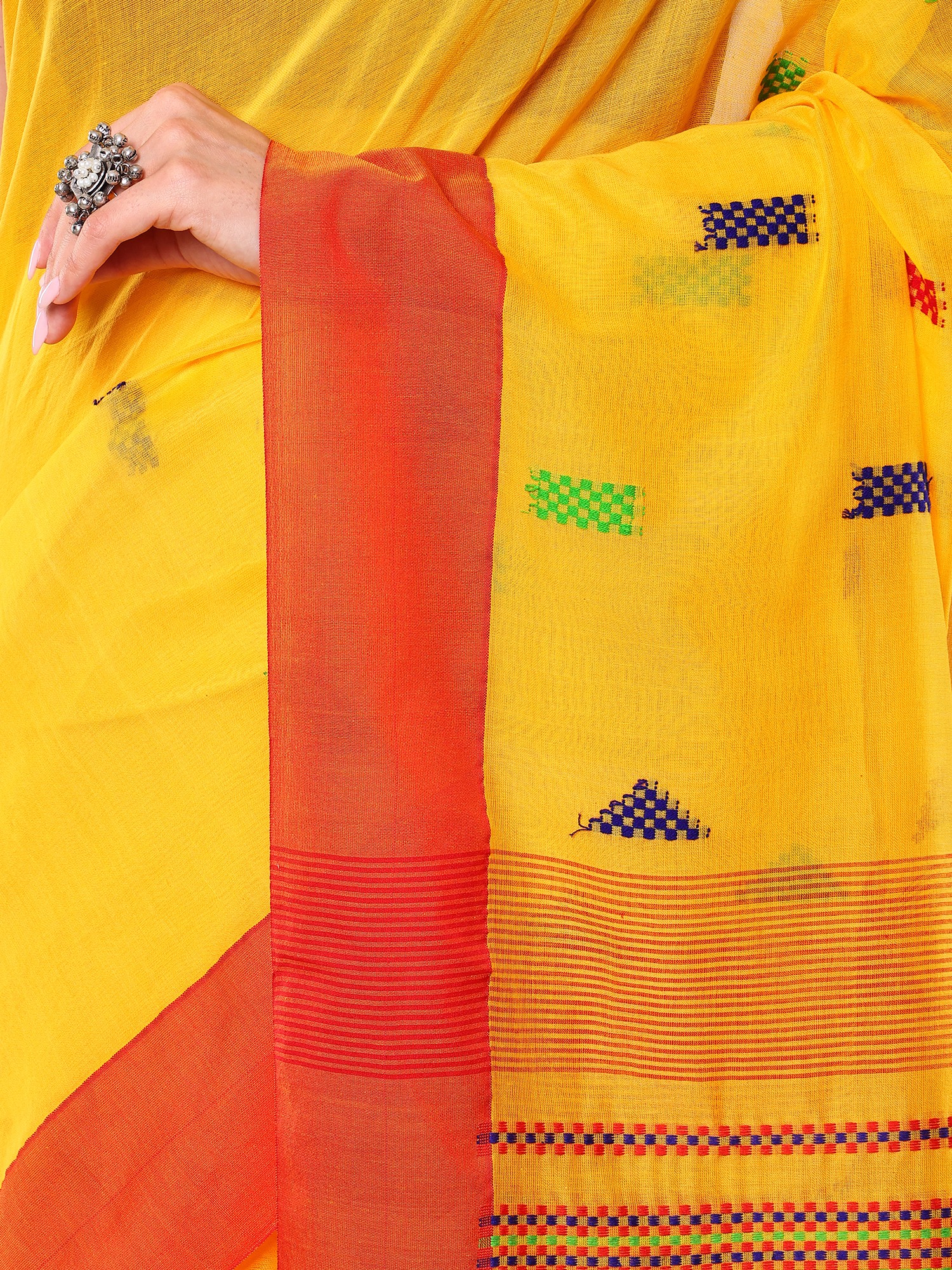 The striking golden-yellow hue provides a brilliant canvas, accentuated by a bold, contrasting red border that frames the entire piece with undeniable elegance. Scattered across the fabric, you'll discover charming woven motifs in blues, greens, and reds, adding a delightful textural and visual dimension. The feel of the pure cotton against your skin is soft and breathable, promising comfort and a graceful flow with every movement.