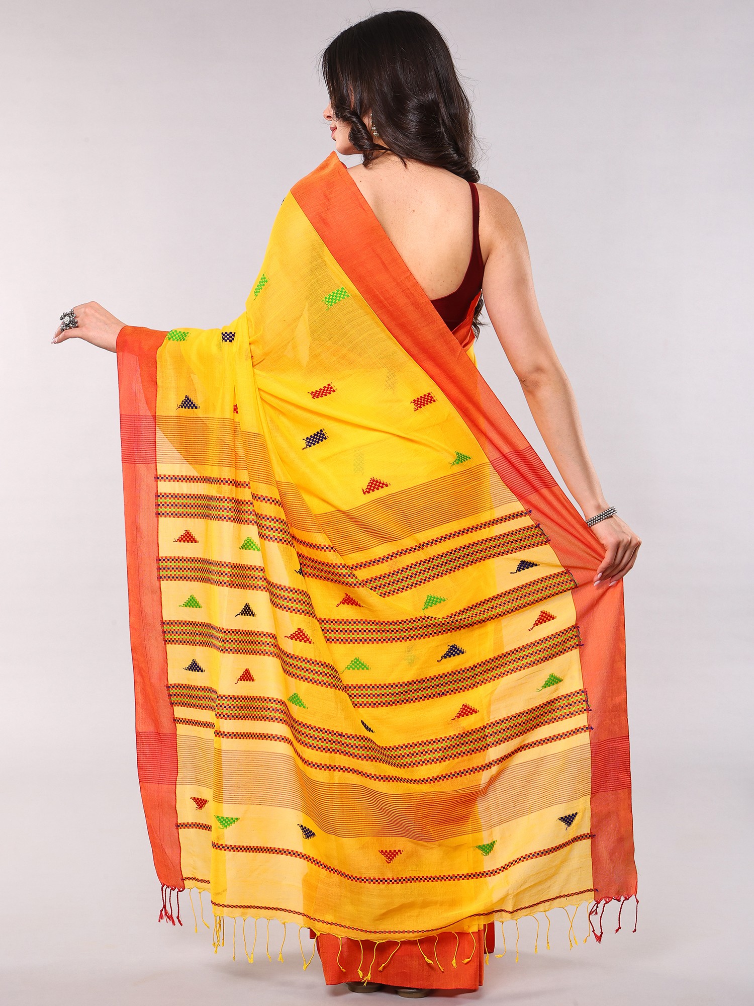 Drawing inspiration from the vibrant textile traditions of Bengal, this piece embodies the region's rich cultural narrative. The use of natural dyes and time-honored weaving techniques connects you to a heritage that has celebrated beauty and craftsmanship for centuries. It's more than just a garment; it's a wearable piece of history, infused with the spirit of its origin.