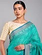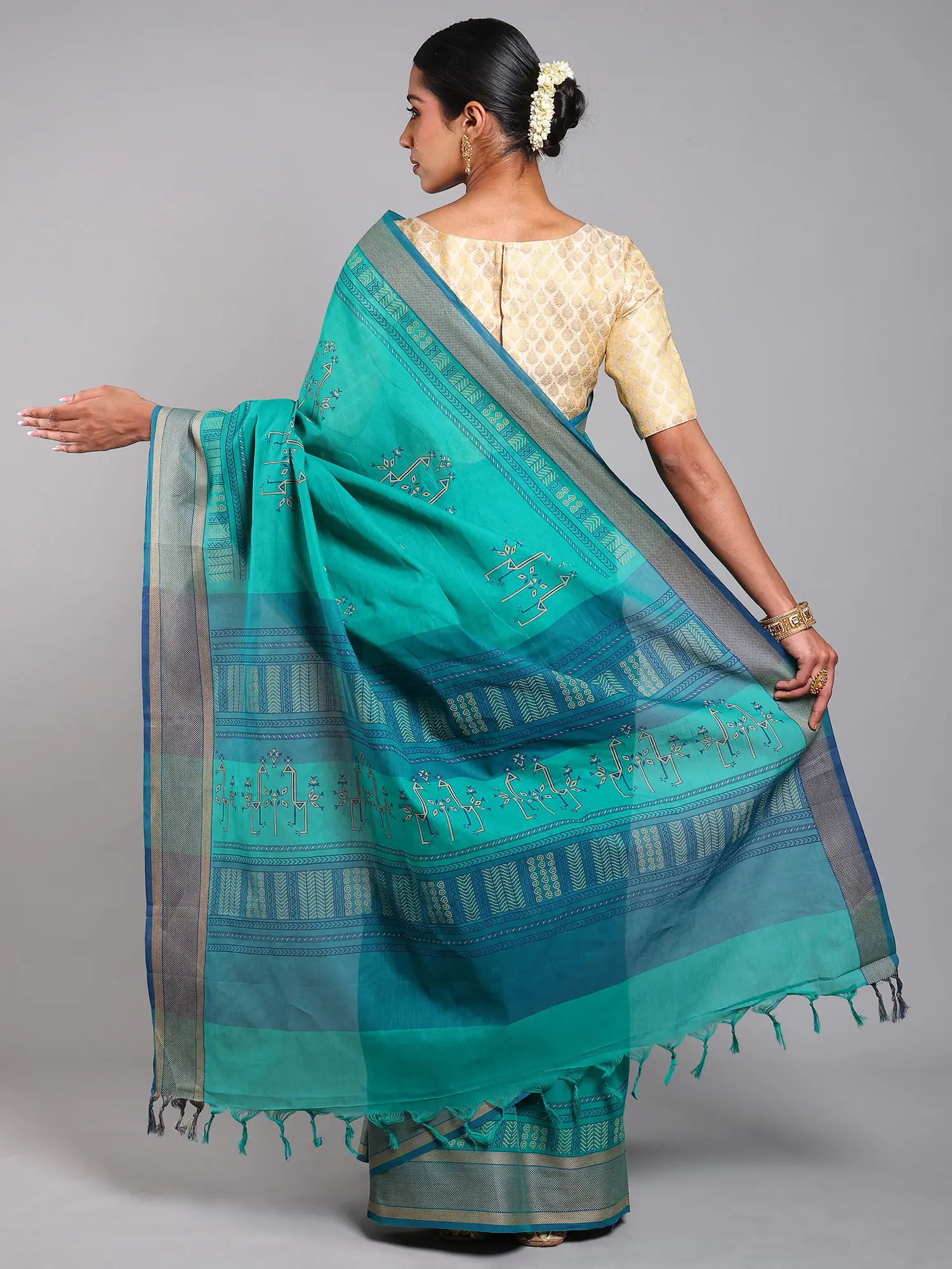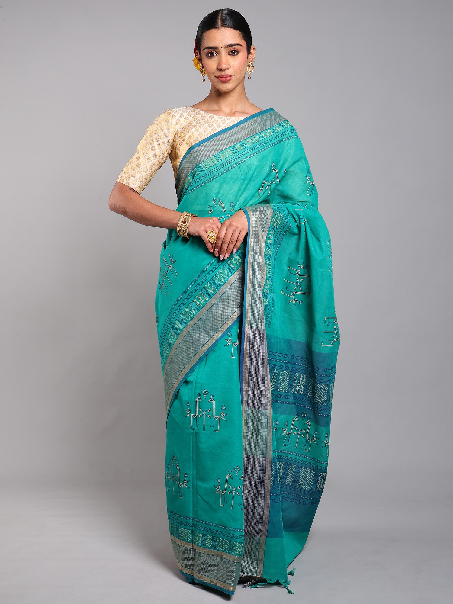 Foam-Green Cotton Saree from Tamil Nadu with Block Printed Trees and Zari Border