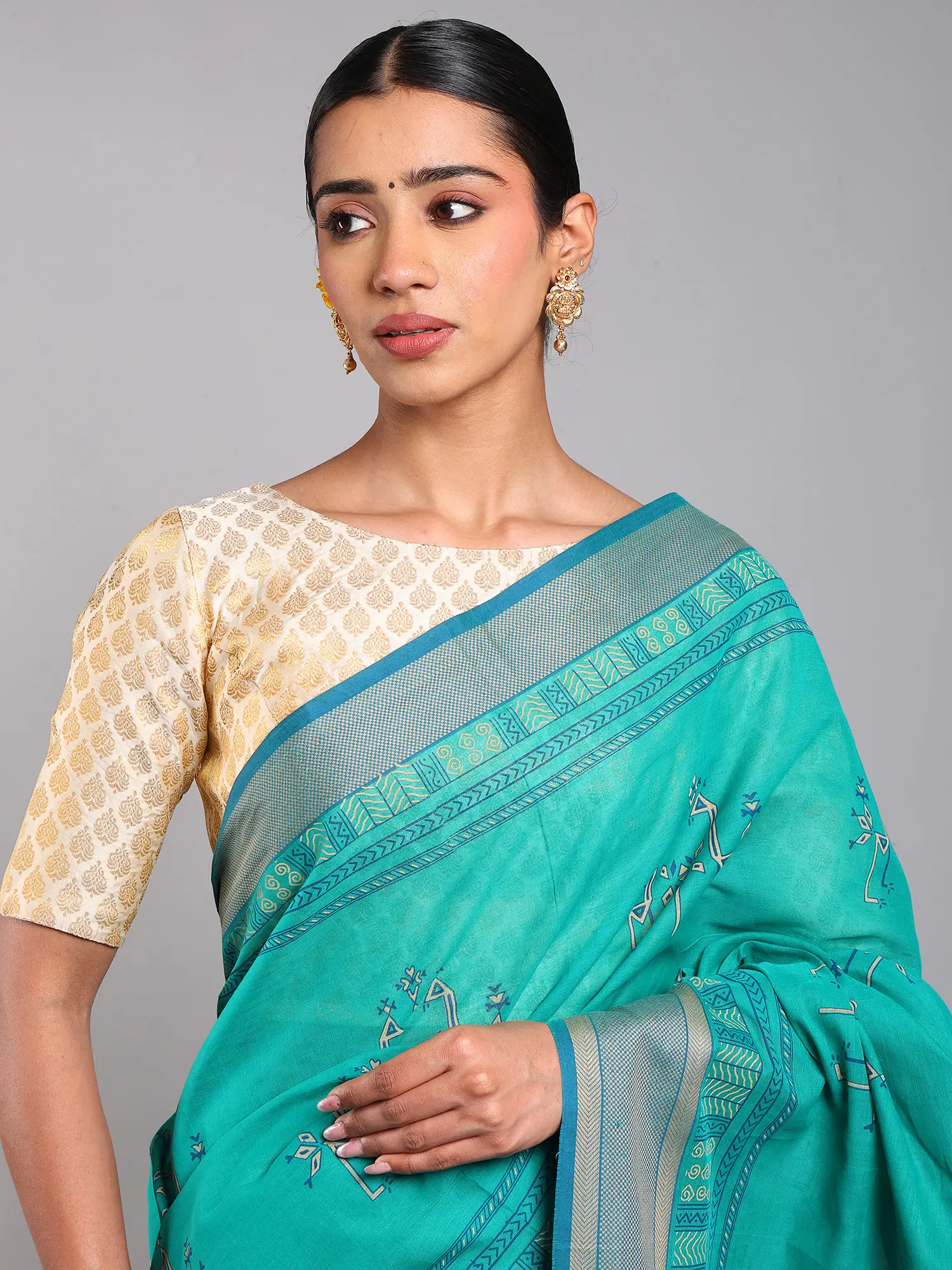 Cannoli-Cream Warli Folk Art Motifs Cotton Saree with Golden Border from Telangana
