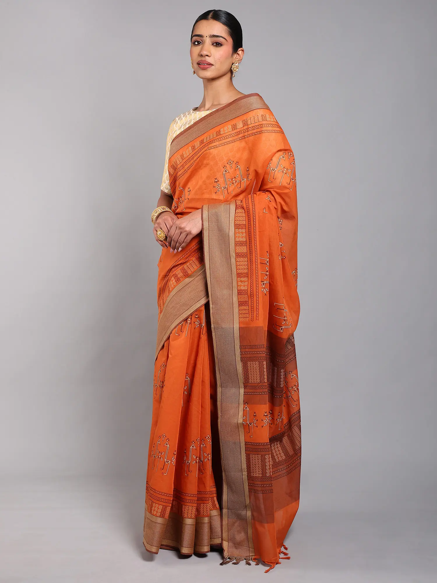 Cotton Saree with Block Printed Floral Motifs and Zari Border from Tamil Nadu