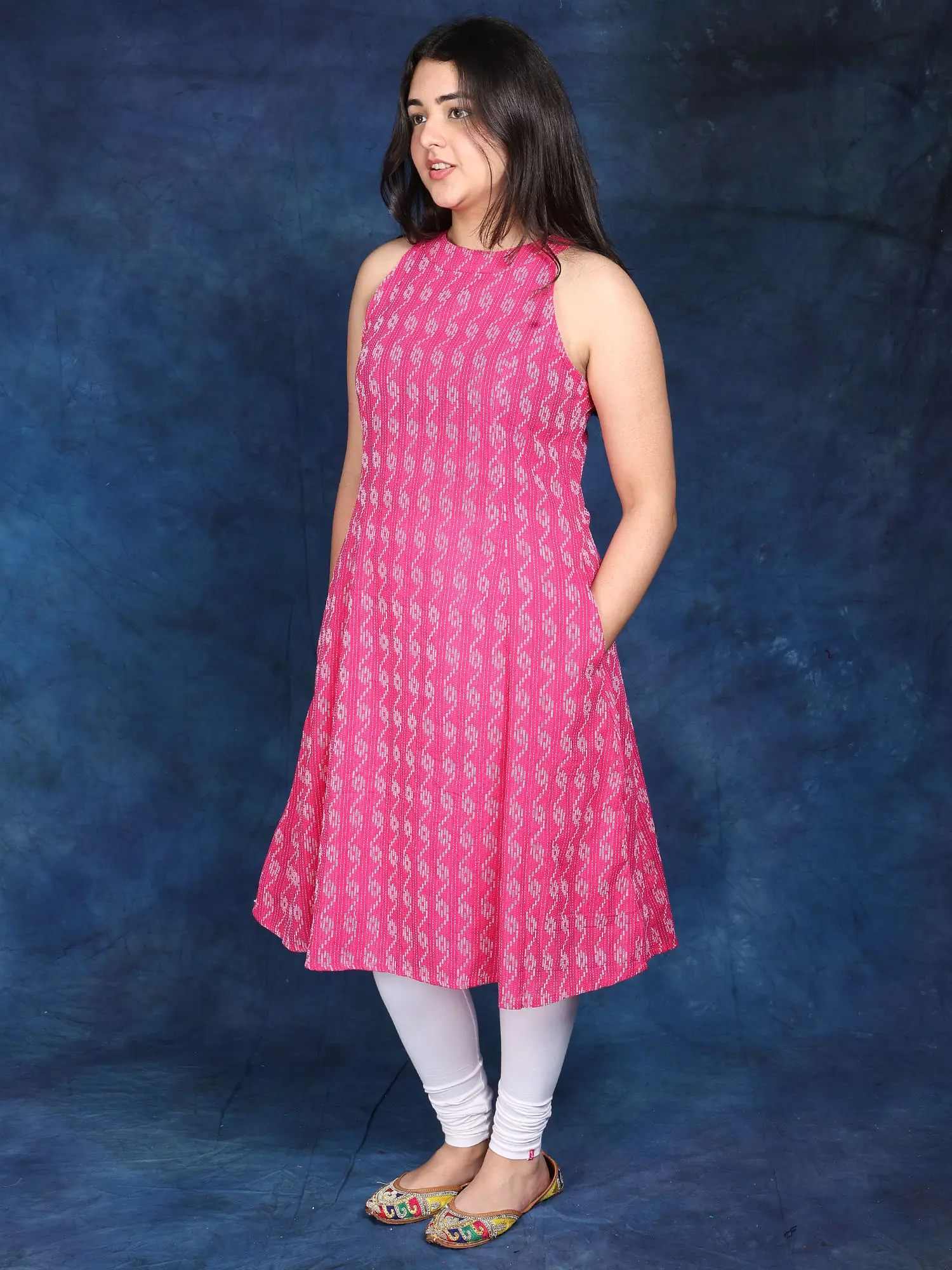 This vibrant pink sleeveless kurti is the perfect blend of comfort and style. Crafted from soft, breathable cotton, it drapes beautifully, ensuring a flattering fit and feel throughout the day. The intricate woven pattern adds a touch of elegance, making this kurti suitable for a variety of occasions – from casual outings to more formal events. Its versatility makes it a must-have addition to your wardrobe. The A-line silhouette skims your body gracefully and the length falls to a comfortable midi. The sleeveless design is perfect for warmer weather, while the side pockets offer both practicality and a chic design element.