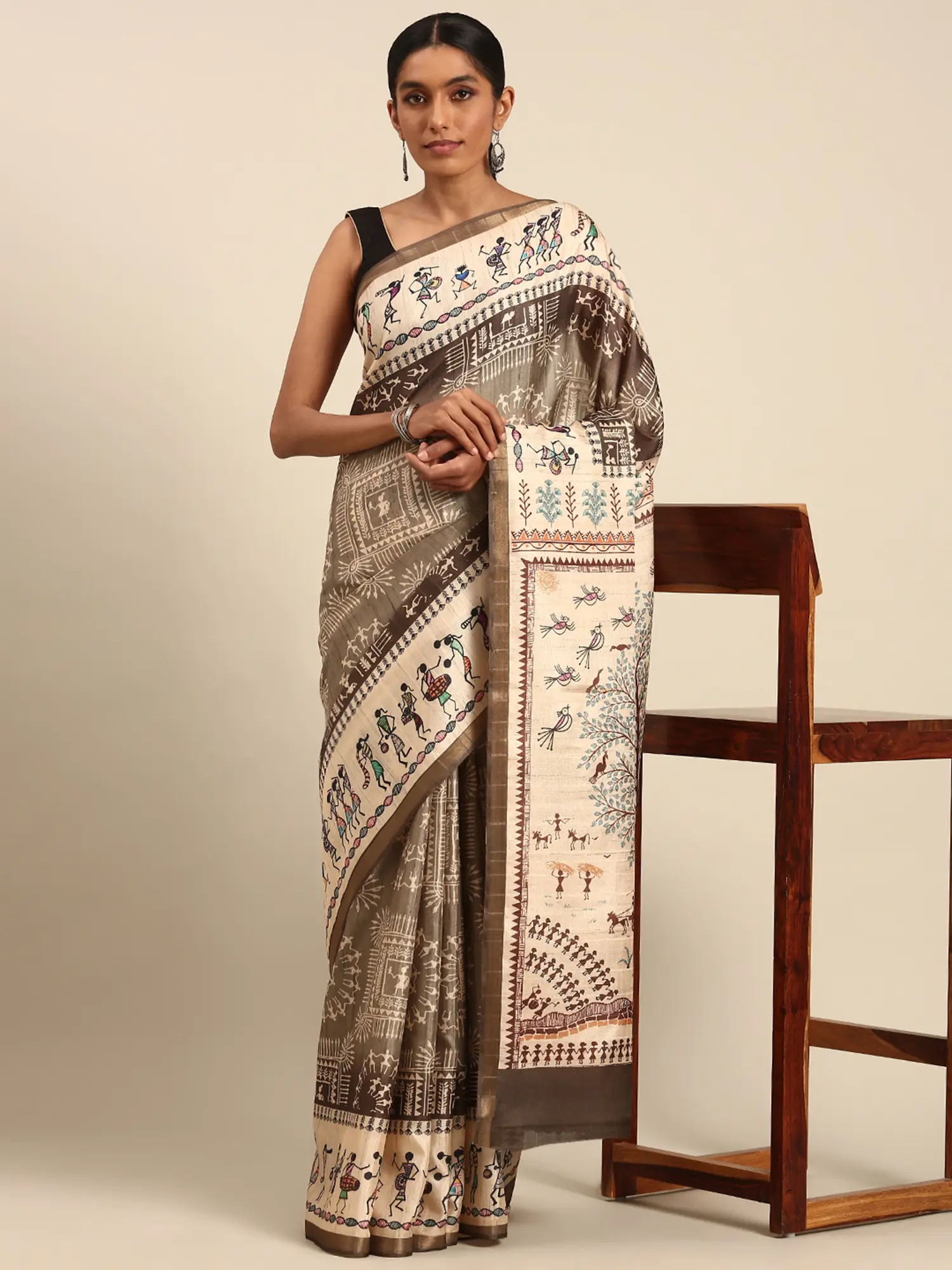 The saree features a harmonious blend of earthy tones and delicate details. The base fabric offers a comfortable and breathable feel, perfect for any festive occasion. The true highlight lies in the meticulously printed Warli motifs. You’ll discover charming depictions of human figures engaged in various activities – dancing, farming, and celebrating – alongside stylized trees, birds, and geometric patterns that form a captivating narrative across the drape. The border is a celebration of Warli's iconic style, drawing the eye with its detailed illustrations and vibrant yet subtle color palette.