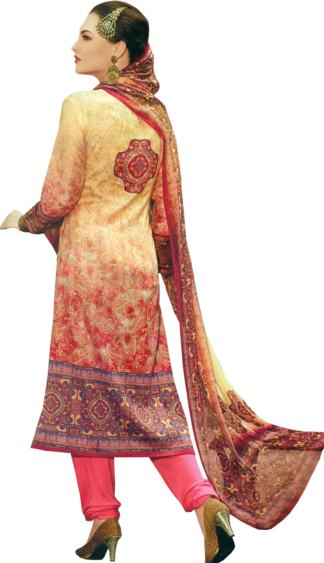 Enjoy the richness of ethnic Indian patterns with the breathability and lightness that you seek from your casual wear. This cream and pink salwar kameez displays enchanting Indian patterns all over, with the magic of digital print ensuring an ornate appeal without adding any heaviness. The soft polycotton fabric is tailored to fit you beautifully, along with churidar pants that add symmetry and a lovely dupatta to give you a perfect traditional charm.