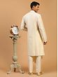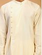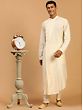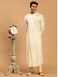 This classic attire, crafted from a luxurious viscose blend, is a sartorial symphony of comfort and elegance. Its creamy hue evokes visions of serene sunsets, while the draping style adds an air of effortless grace. This ensemble embodies timeless sophistication, with its simplicity serving as a canvas for personal expression. The soft, breathable fabric ensures day-long comfort, while the meticulous craftsmanship guarantees a perfect fit. Whether it is a casual gathering or a formal affair, this “Kurta-Pajama” set exudes understated charm, making it a must-have addition to any discerning wardrobe.