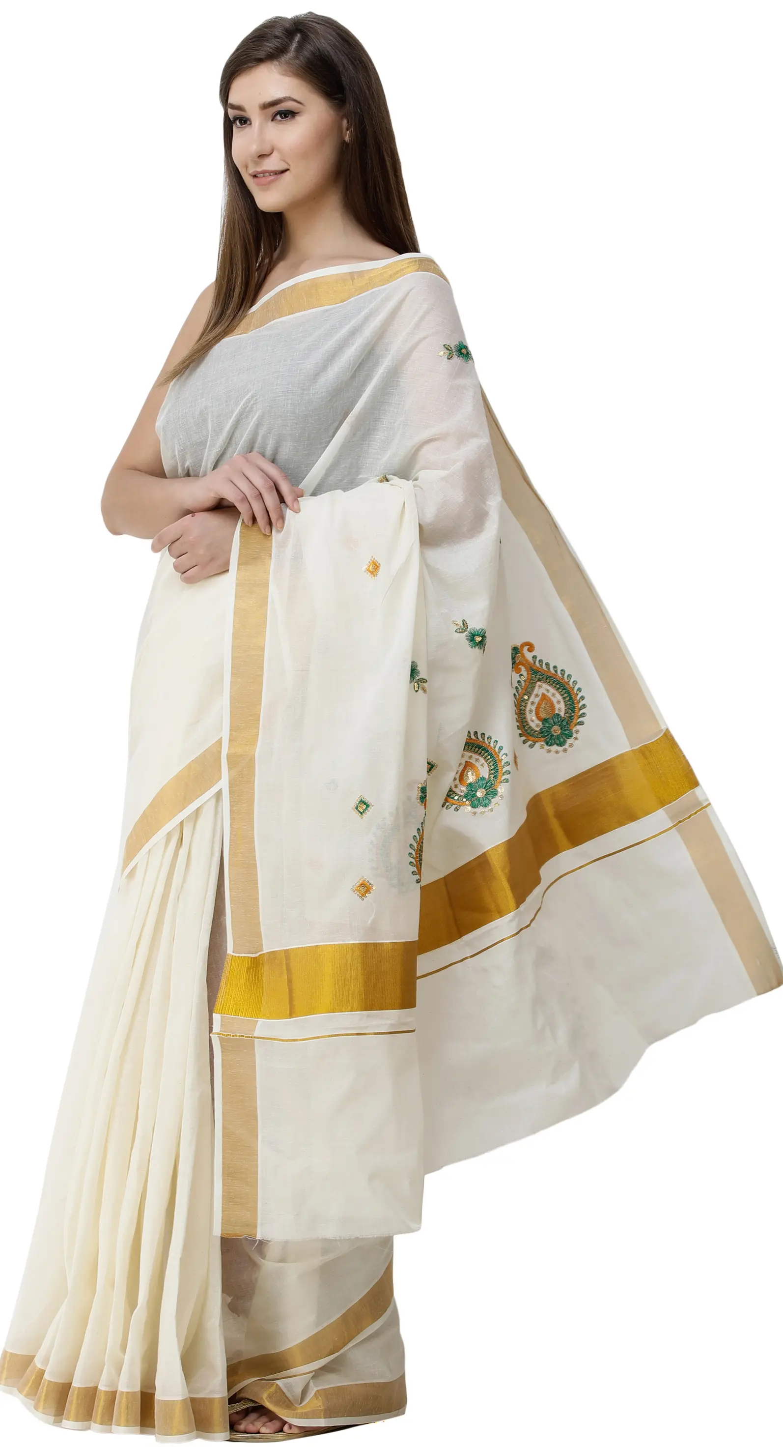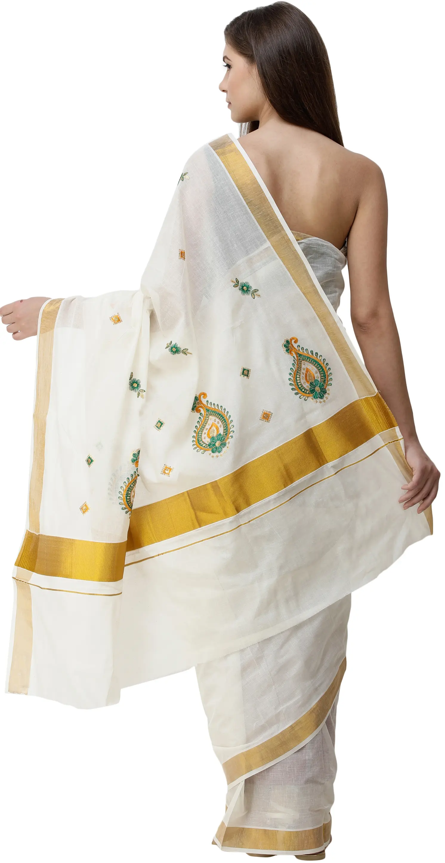 Cream Kasavu Sari from Kerala with Embroidered Motifs and Golden Border