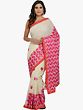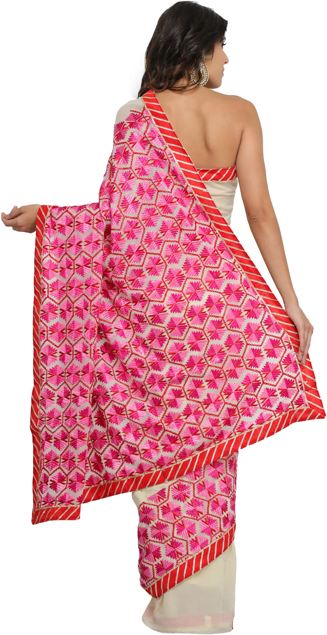 Complementing the intricate Phulkari work is a striking patch border. This border, rendered in a vibrant red with elegant golden-silver stripes, adds a sophisticated and eye-catching contrast to the cream fabric and pink embroidery. The combination of the soft crepe, the intricate pink Phulkari, and the bold striped border creates a harmonious blend of textures and colors. This thoughtful design ensures the saree stands out for any occasion, whether it's a festive celebration, a wedding, or a special gathering.