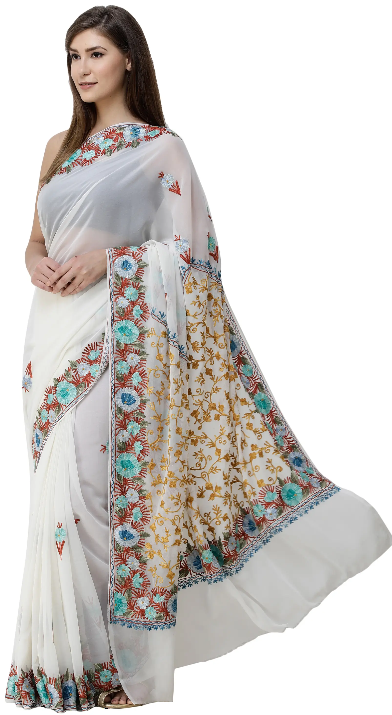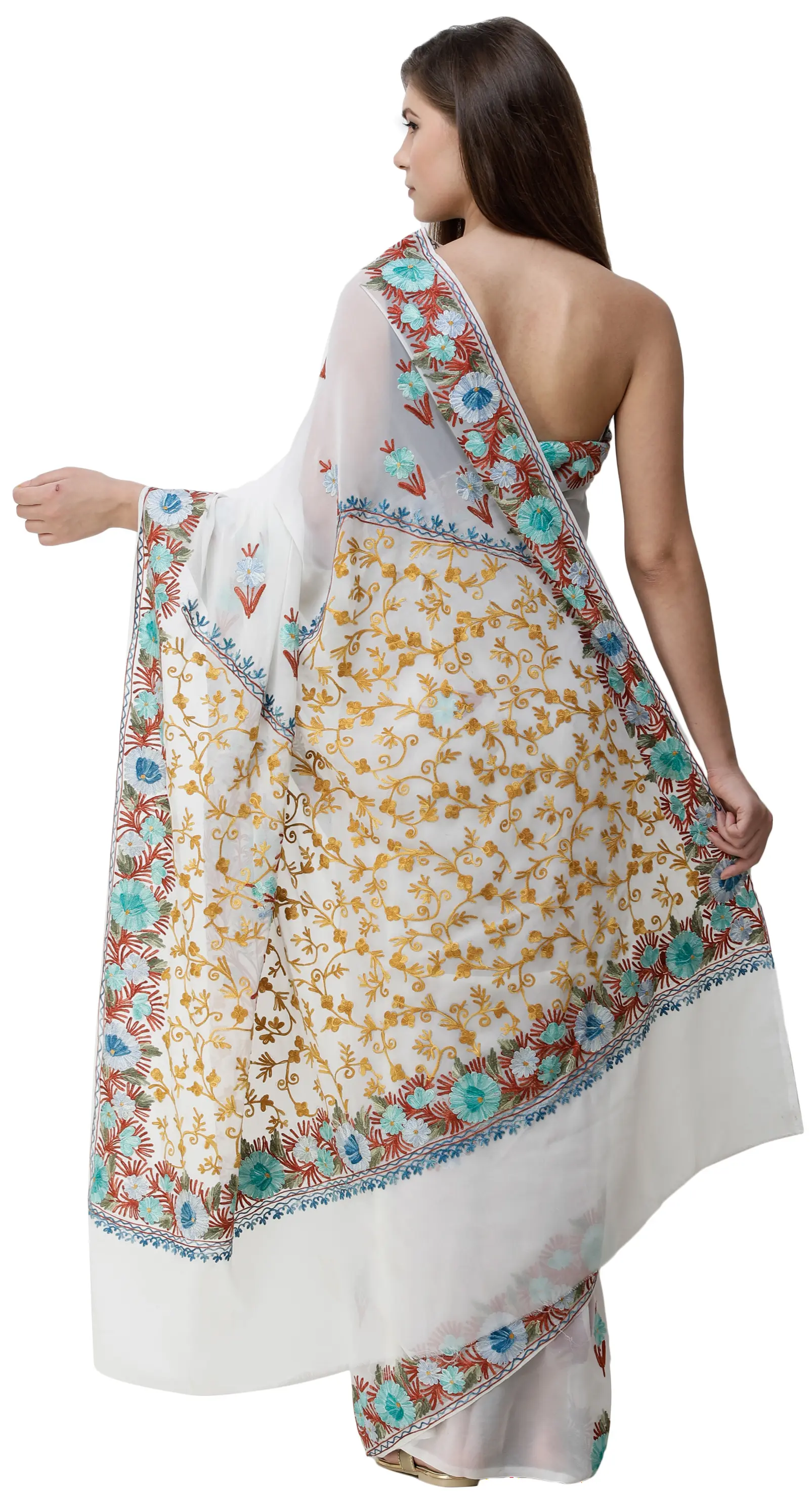 Ivory Georgette Saree from Kashmir with Chain Stitch Aari Embroidered Paisleys Border and Pallu
