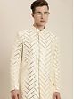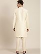 Adorned with intricate craftsmanship, this ensemble (Cream Silk Blend Indo-western Mirror Work Sherwani) is a sartorial masterpiece that transcends time. Its opulent fusion of traditional and contemporary elements creates a visual symphony. The resplendent mirror work, delicately handcrafted, glistens like stars on a moonlit night, weaving tales of elegance and refinement. Crafted from a sumptuous silk blend, it drapes with regal grace, enveloping you in a cocoon of luxury. Paired with the “Viscose Blend Pant Style Pajama”, it strikes a harmonious balance between comfort and sophistication. This ensemble is not just clothing; it is a captivating narrative of style and heritage, an ode to timeless fashion.