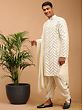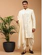 Step into a world of opulence and elegance with this Cream Silk Blend “Sherwani”, adorned with exquisite mirror embroidery that glistens like stars in the night sky. This masterpiece of craftsmanship combines tradition with contemporary style, creating a regal aura that is simply mesmerising. Paired with a “Viscose Blend Cowl Style Patiala Dhoti”, this ensemble offers unparalleled comfort and sophistication. The matching Dupatta drapes gracefully, completing the royal look. With its impeccable specifications, this ensemble is not just clothing; it is a statement of refined taste, a manifestation of enchanting beauty, and a celebration of cultural richness.