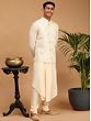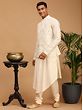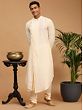 Draped in elegance, this Cream Viscose Asymmetric Kurta Pajama Set adorned with Mirror Embroidered Chevron Pattern Jacket is a masterpiece of sartorial artistry. Crafted from sumptuous viscose, the Kurta Pajama ensemble flows like a river of cream, offering both comfort and style. The silky blend jacket, a celestial cascade of opulence, mirrors the heavens with its intricate mirror embroidery in a captivating chevron pattern. As you slip into this ensemble, you become a canvas upon which threads of luxury are painted. It is not just clothing; it is a poetic symphony of fabric, design, and grace that transforms you into a vision of pure allure.