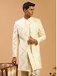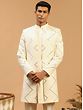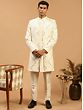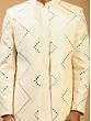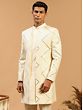 This regal attire (Indo-Western Sherwani) is an exquisite embodiment of timeless elegance and modern allure. Crafted from luxurious viscose, it drapes you in a cascade of creamy opulence. The intricate zig-zag pattern, adorned with mesmerizing mirror work, catches and reflects the light, creating a symphony of dazzling radiance. This Indo-Western masterpiece melds tradition with contemporary flair, making it a sartorial triumph. When you step into this Sherwani, you transcend mere attire; you become a living, breathing work of art, enchanting all who are fortunate enough to witness your presence.