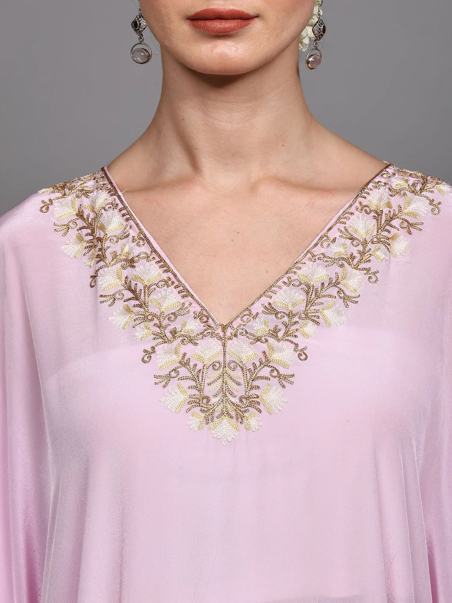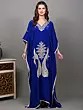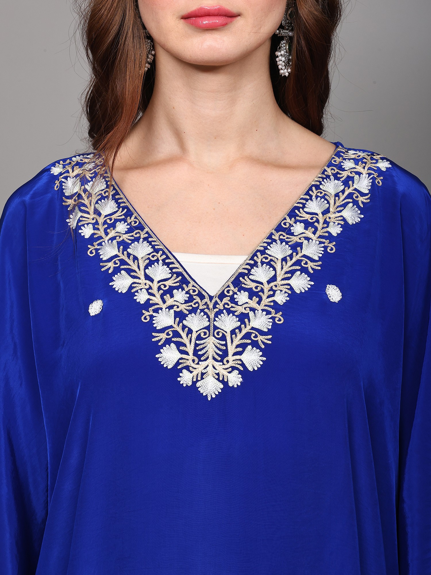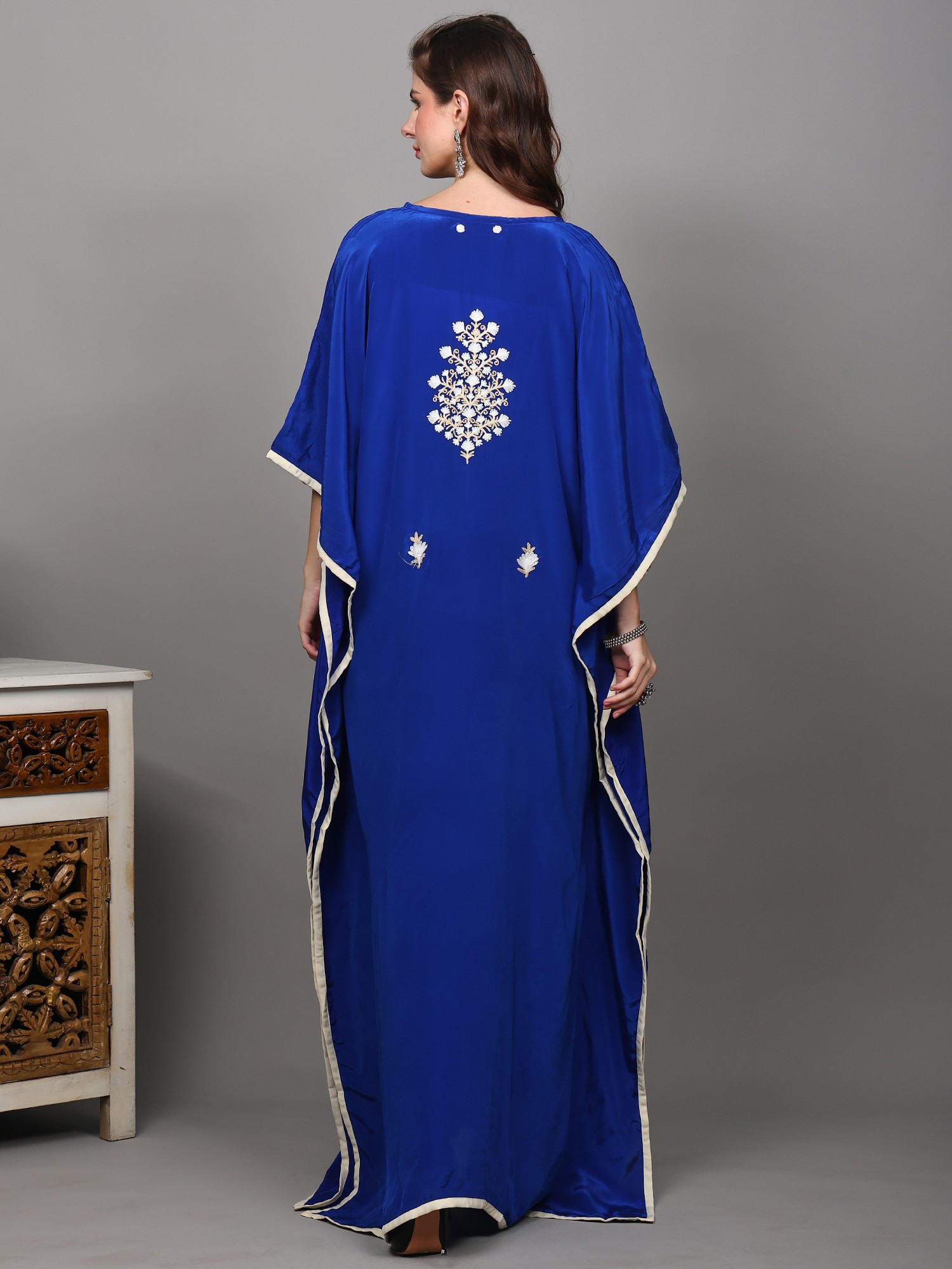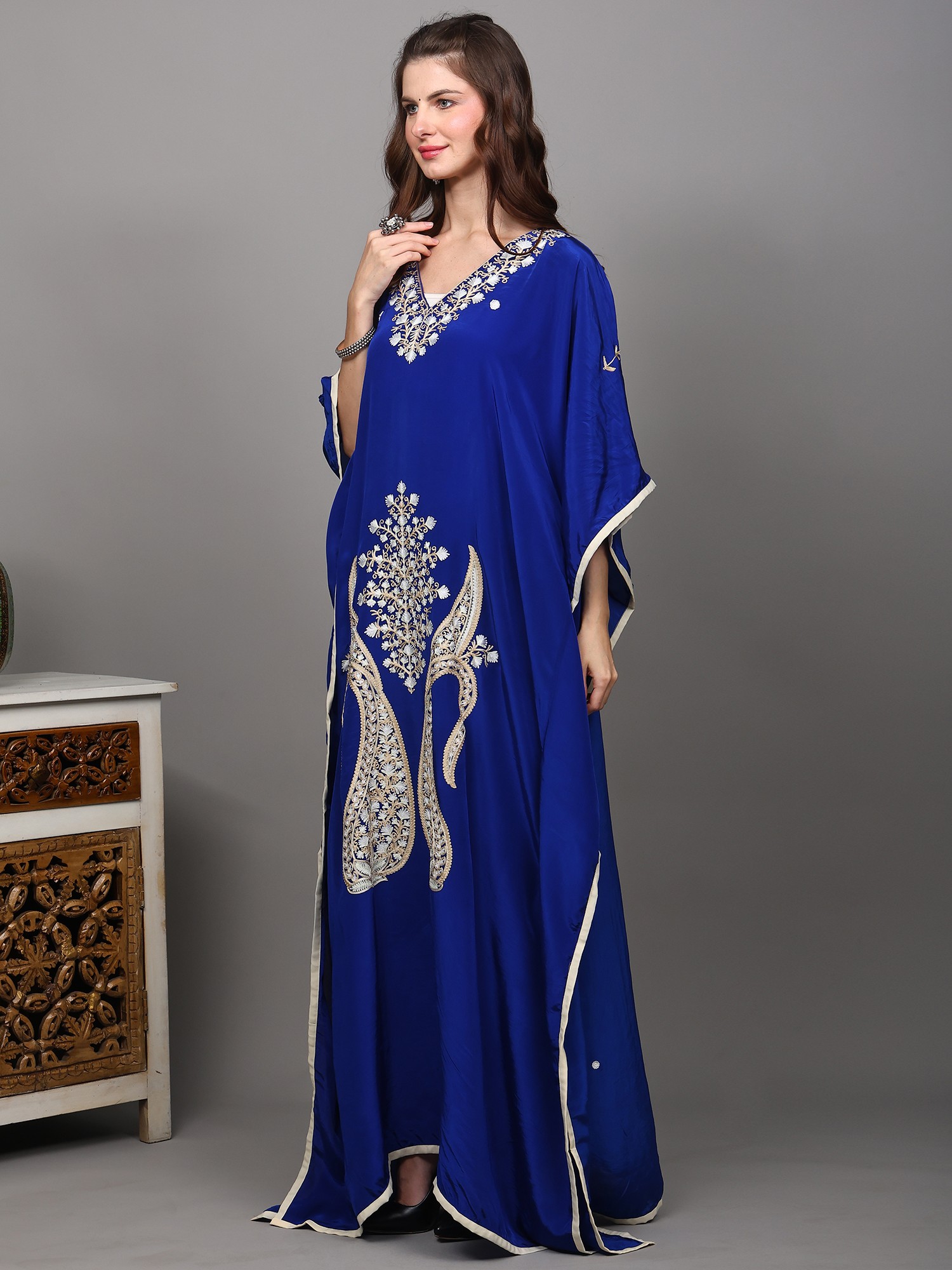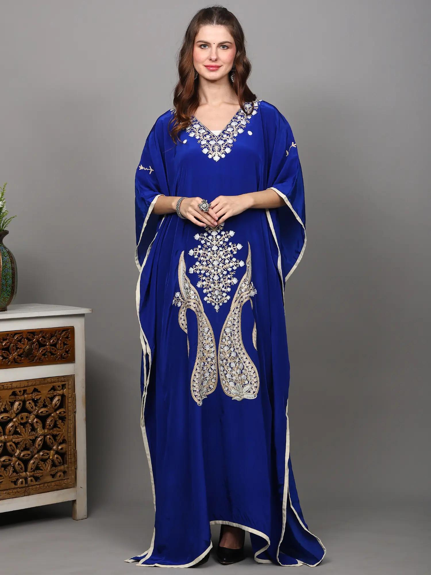 The true star of this exquisite piece is the intricate Aari embroidery that adorns it. Skilled artisans have meticulously hand-embroidered large, stylized paisley motifs that cascade down the front of the kaftan. The paisleys, rendered in shimmering white and silver threads, are a celebration of nature's grace and symmetry. The delicate detailing and the subtle sheen of the embroidery catch the light beautifully, adding a touch of glamour and allure. The V-neckline is also beautifully framed with the same intricate embroidery, drawing attention to your décolletage. The wide, flowing sleeves are a hallmark of the kaftan style, providing an air of relaxed sophistication.