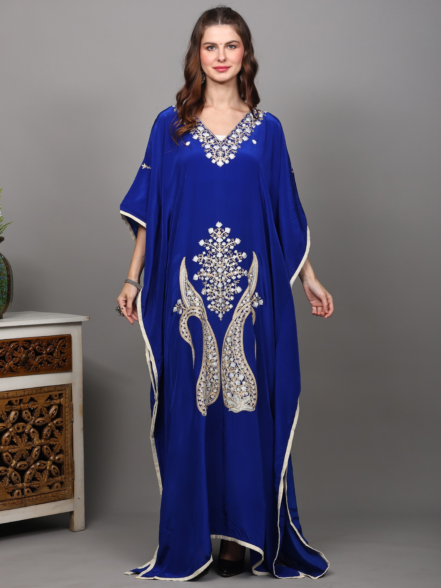 Crafted from luxurious crepe, this kaftan promises a soft, smooth feel against your skin and a graceful flow with every movement. Its generous cut ensures comfort and freedom, making it perfect for a variety of occasions. Whether you're attending a special evening event, enjoying a leisurely brunch with friends, or seeking a stylish yet comfortable option for lounging at home, this kaftan delivers. Pair it with elegant sandals and statement jewelry for a captivating evening look, or style it with comfortable flats for a more relaxed yet refined ensemble. The timeless design and the rich embellishments ensure that this kaftan will remain a cherished addition to your wardrobe for years to come. Embrace the artistry and luxury of this unique piece and let it transport you to a world of timeless beauty.
