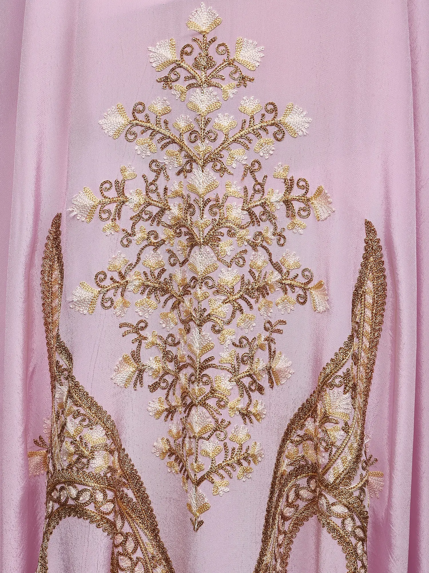 The true star of this exquisite piece is the intricate Aari embroidery that adorns it. Skilled artisans have meticulously hand-embroidered large, stylized paisley motifs that cascade down the front of the kaftan. The paisleys, rendered in shimmering white and silver threads, are a celebration of nature's grace and symmetry. The delicate detailing and the subtle sheen of the embroidery catch the light beautifully, adding a touch of glamour and allure. The V-neckline is also beautifully framed with the same intricate embroidery, drawing attention to your décolletage. The wide, flowing sleeves are a hallmark of the kaftan style, providing an air of relaxed sophistication.