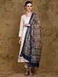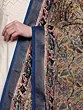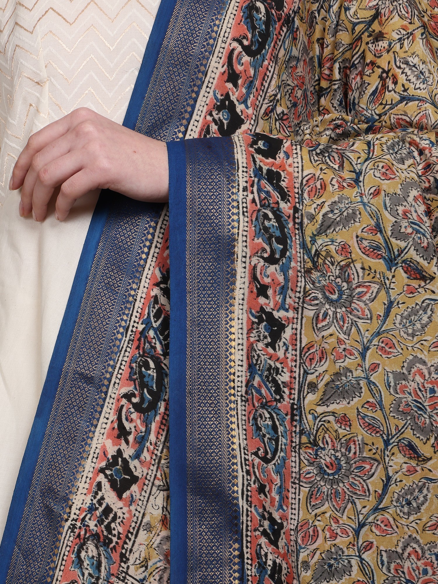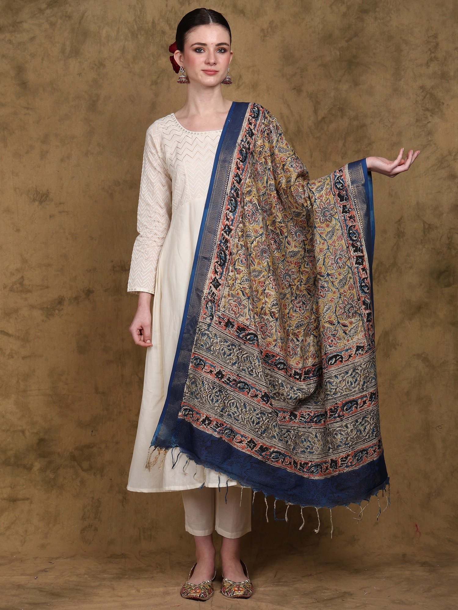 The use of 100% silk elevates this dupatta to a level of unparalleled luxury. The soft, flowing drape of the silk perfectly complements the intricate Kalamkari designs. The rich texture and luxurious feel make it a pleasure to wear. The deep blue zari border adds a further layer of elegance, creating a stunning contrast against the warmer tones of the floral print. This combination of textures and colours makes it the perfect accessory to enhance your style, adding a touch of grace and sophistication to your ensemble. Notice the delicate fringing at the dupatta’s hem, a final touch that underscores the handcrafted nature of this exceptional piece.