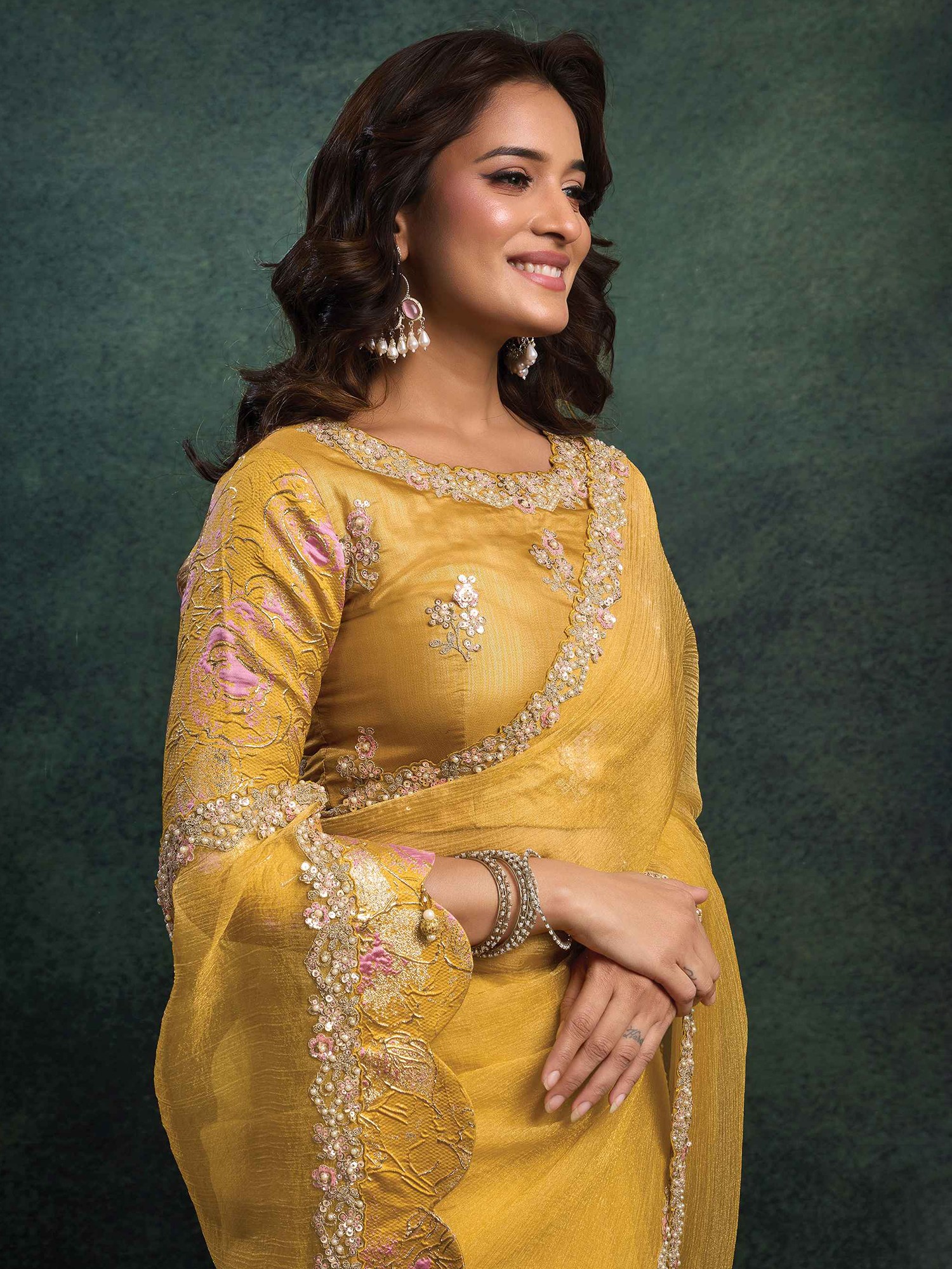 Wedding and Festive Wear Paper Satin Silk Saree with Swarovski and Scallop Zardozi Embroidery in Elegant Traditional Designer Style