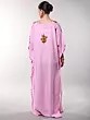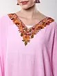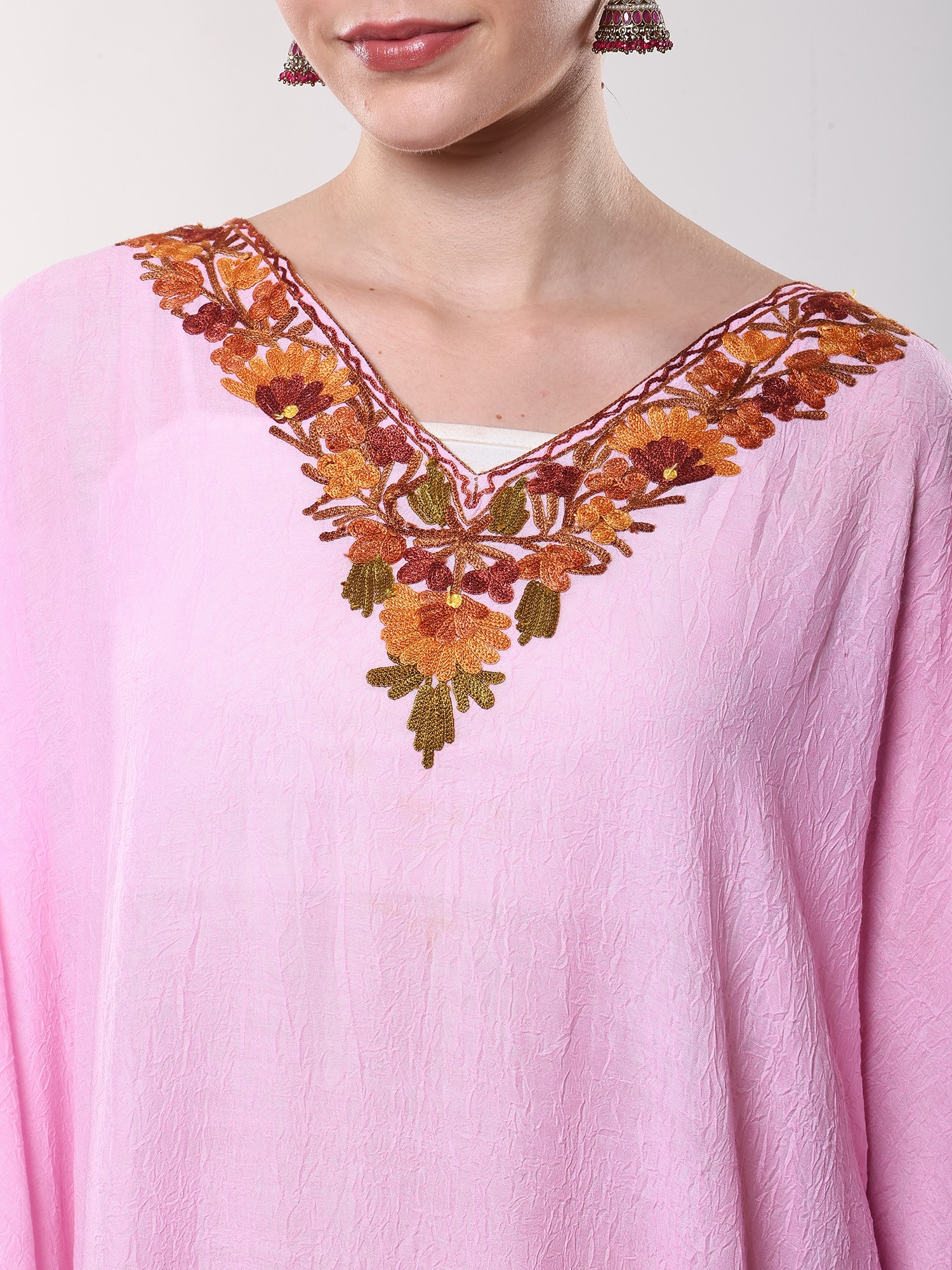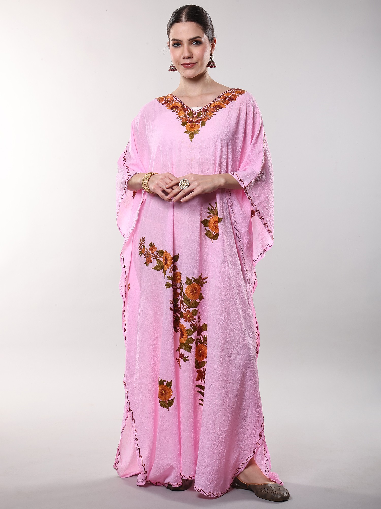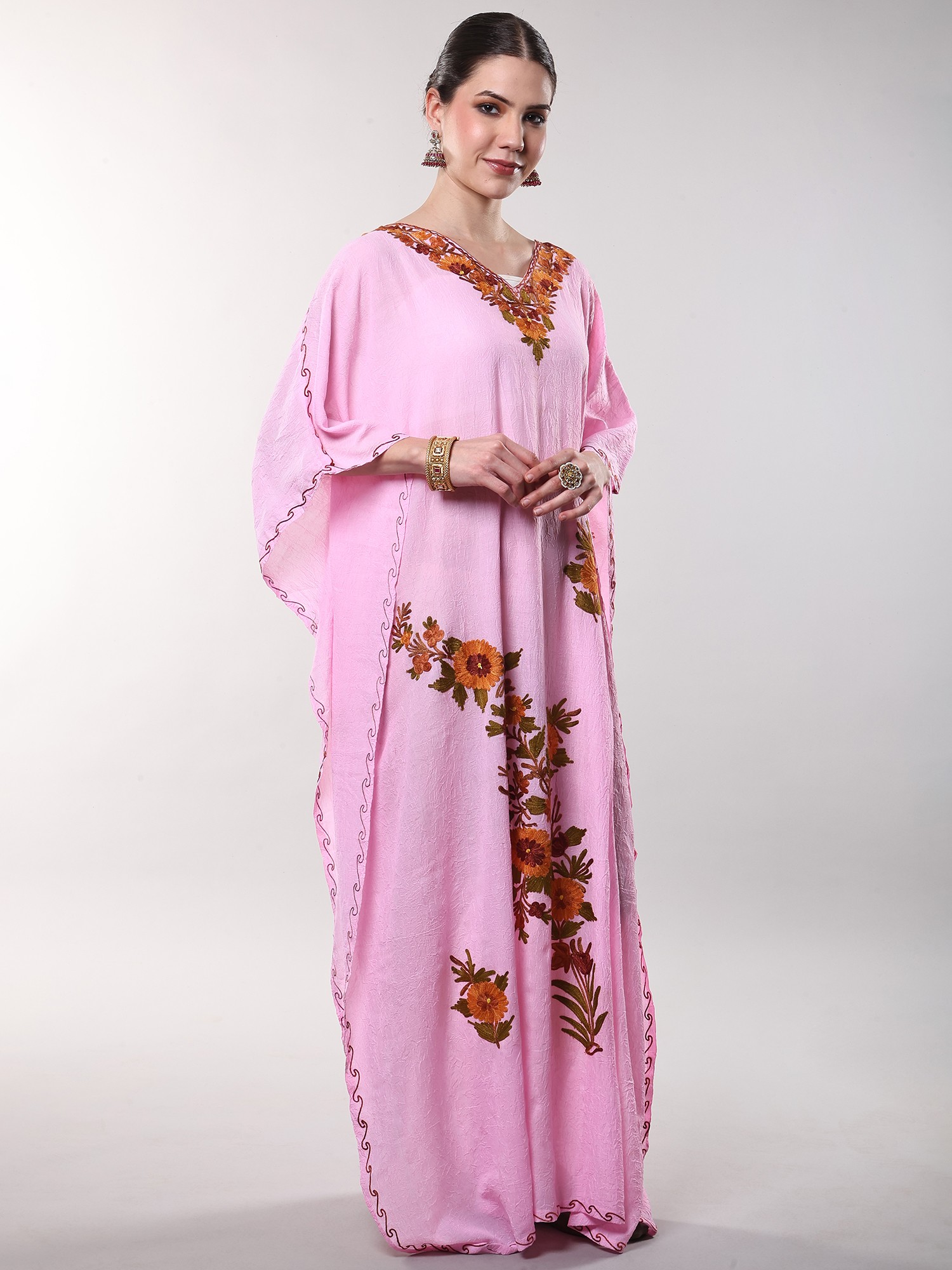 Relish in the stylish comfort of Kaftans with this crushed Kashmiri Kaftan, available in soft hues and a rich touch of Aari to give you a perfect balance of ease and elegance. The soft cotton fabric avails breathability while being intricately covered in ornate Aari work which creates classic floral patterns on the dress, as a gift of Kashmir to your timeless grace.