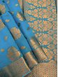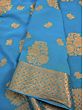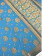 Cyan blue with its vibrant feel gives this chiffon Banarasi Saree a distinctively appealing effect. The body of the saree is covered in small and large motifs traditionally known as Butis and Butas.