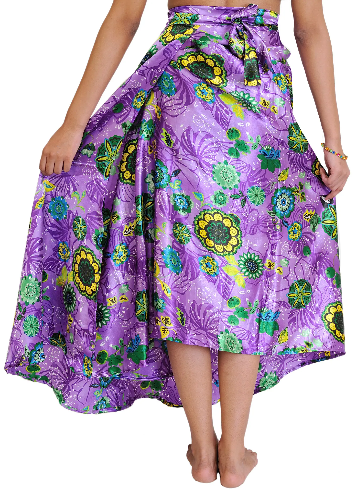 Unleash your inner free spirit with this enchanting wrap-around skirt, a true masterpiece of bohemian charm. Crafted from luxurious satin, this skirt drapes beautifully, offering both comfort and a hint of glamour. The vibrant purple hue serves as a perfect canvas for an explosion of colorful floral prints, featuring a delightful array of blossoms in shades of green, yellow, and blue, interspersed with delicate leaf motifs. This eye-catching design evokes images of lush gardens and sun-drenched days, making it an ideal addition to any warm-weather wardrobe.