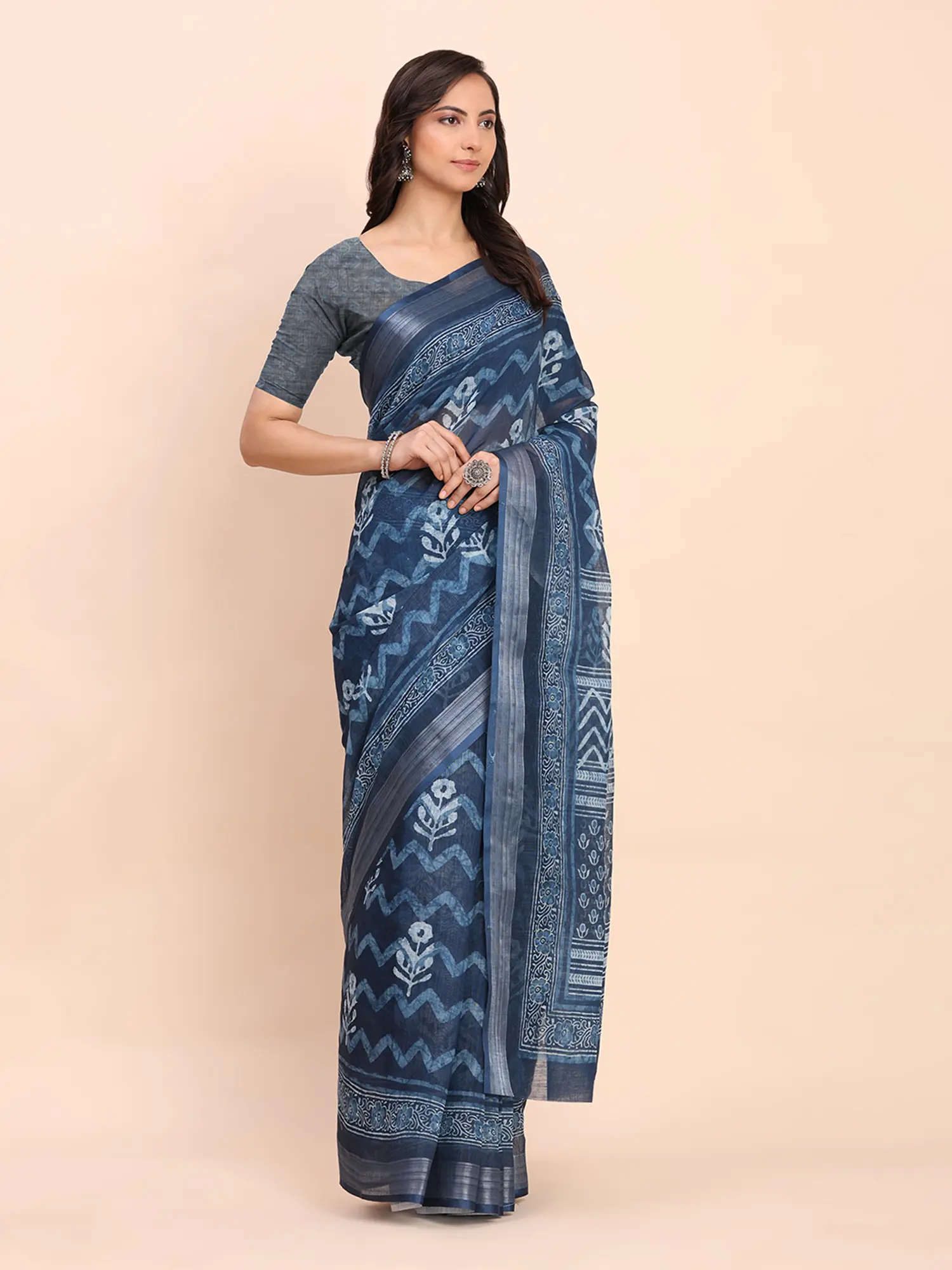Black-Eel Linen Cotton Abstract Printed Attractive Festive Wear Saree With Blouse