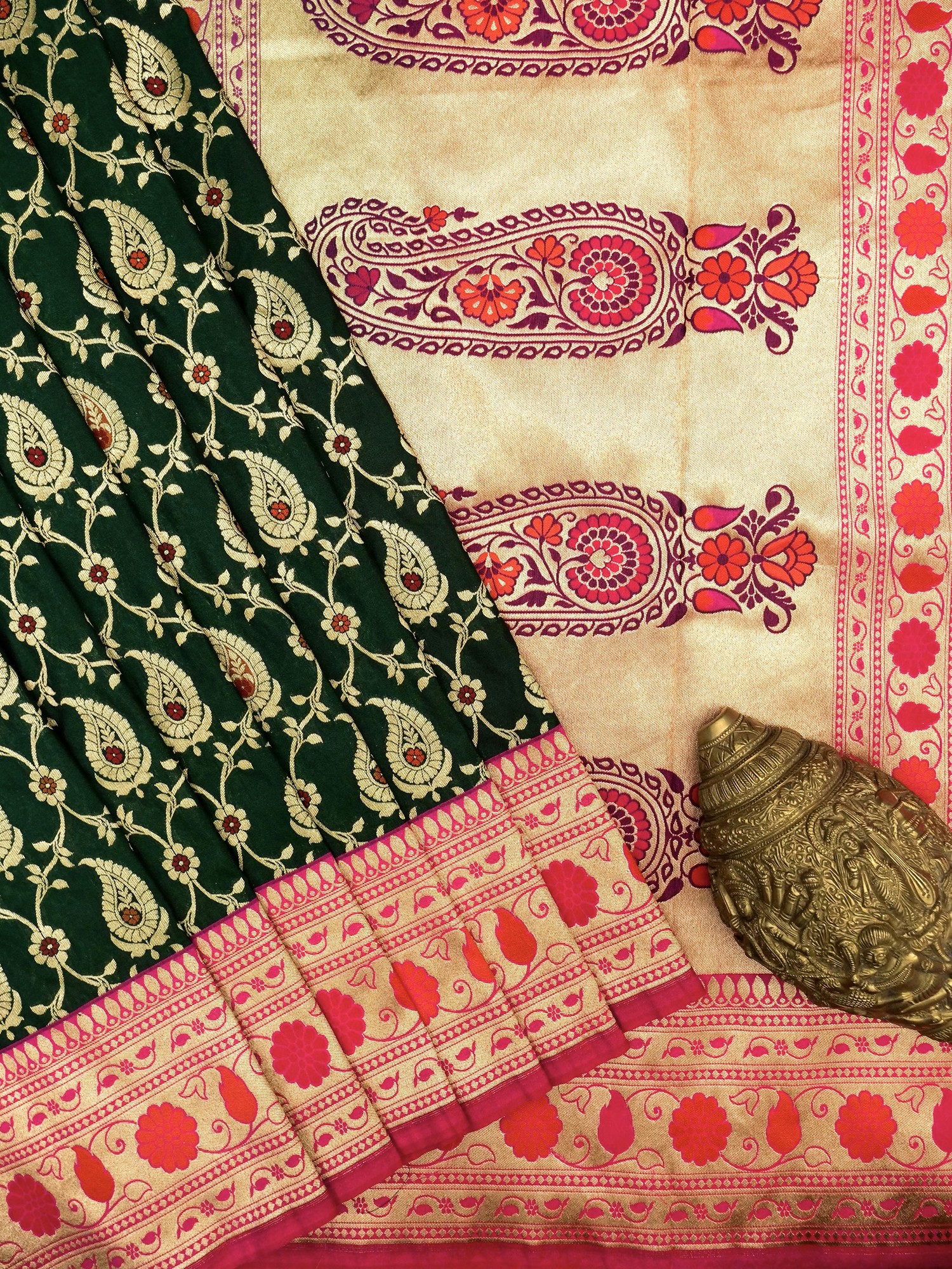 The dark green silken body of the sari is adorned with an intricate mesh or Jangla pattern, with a golden paisley motif interlinked with supple floral vines.