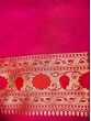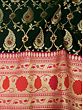 The enchanting beauty of traditional Banarasi Sari comes to you in this deep green Katan silk sari, with a contrasting woven pink-red border that makes it a perfect festive ethnic Indian women's wear.