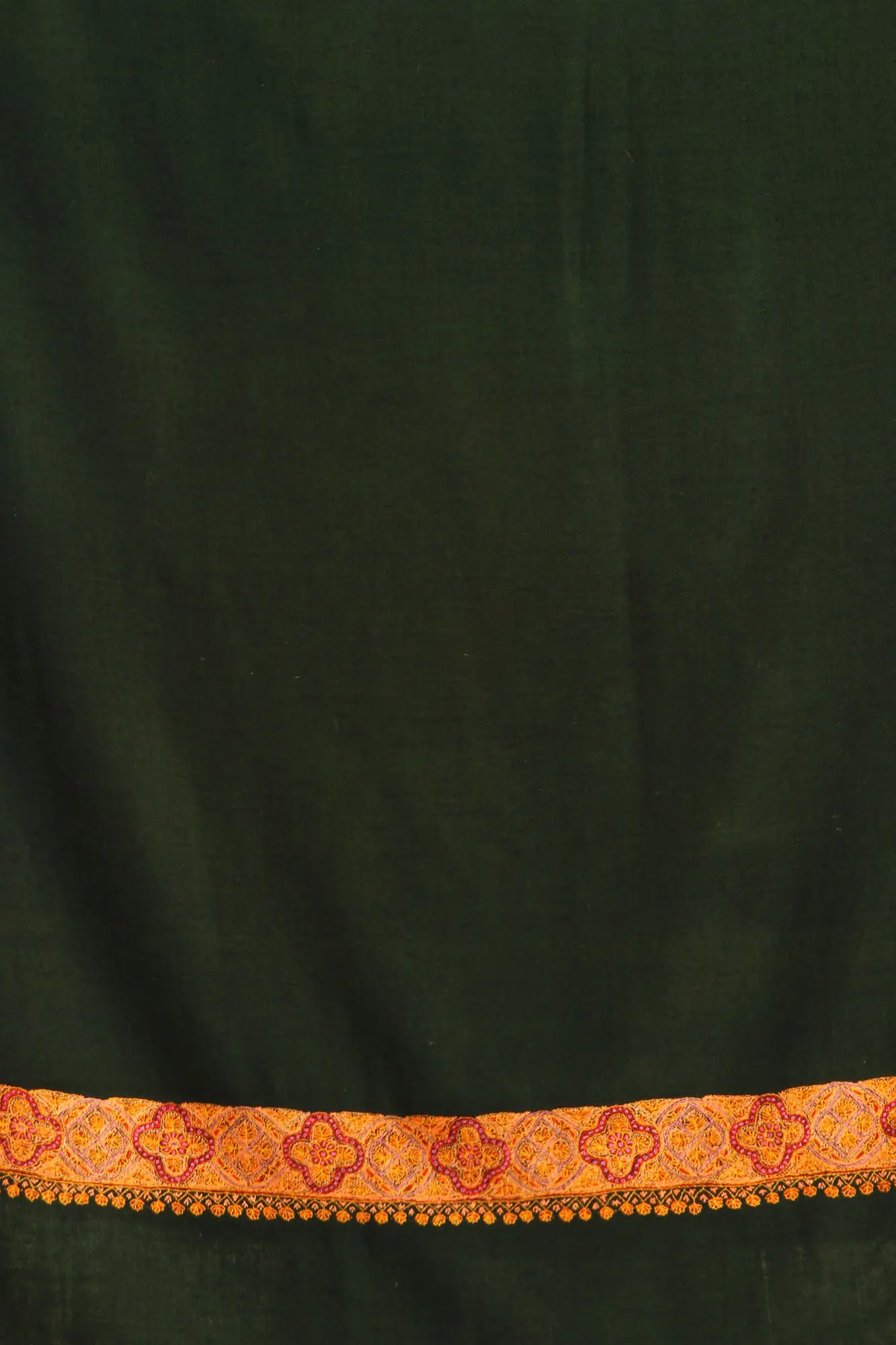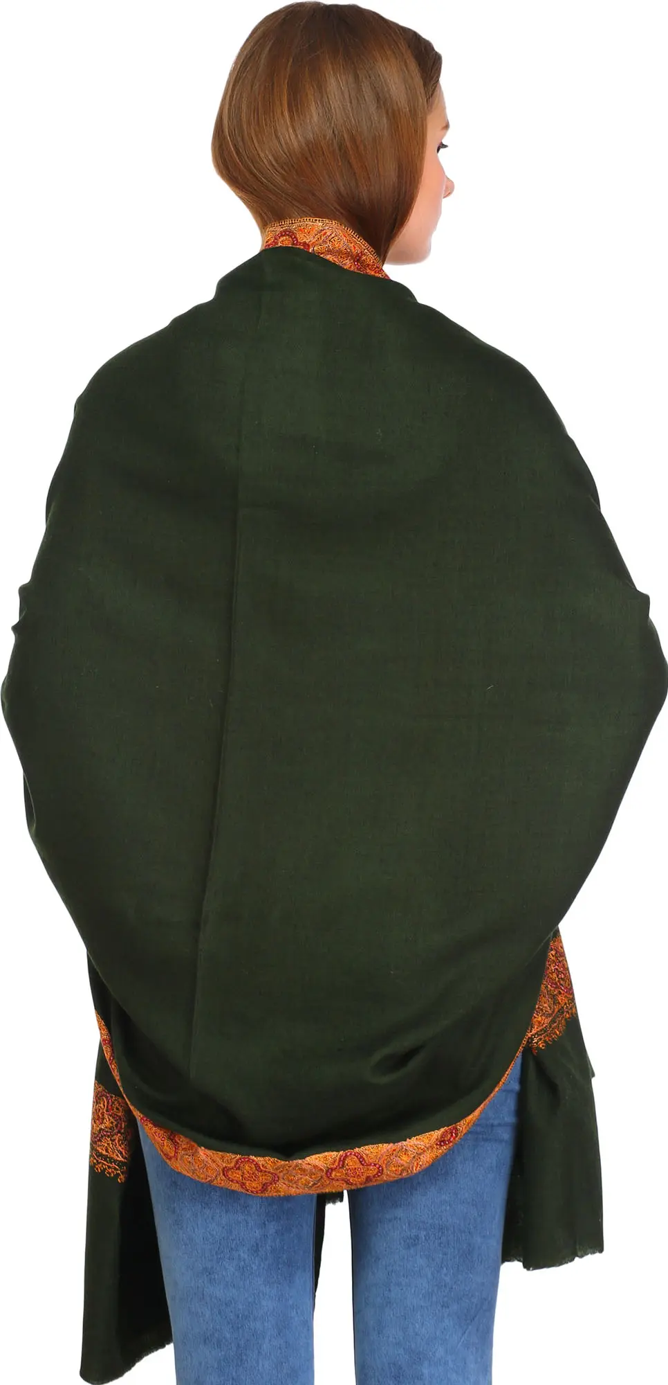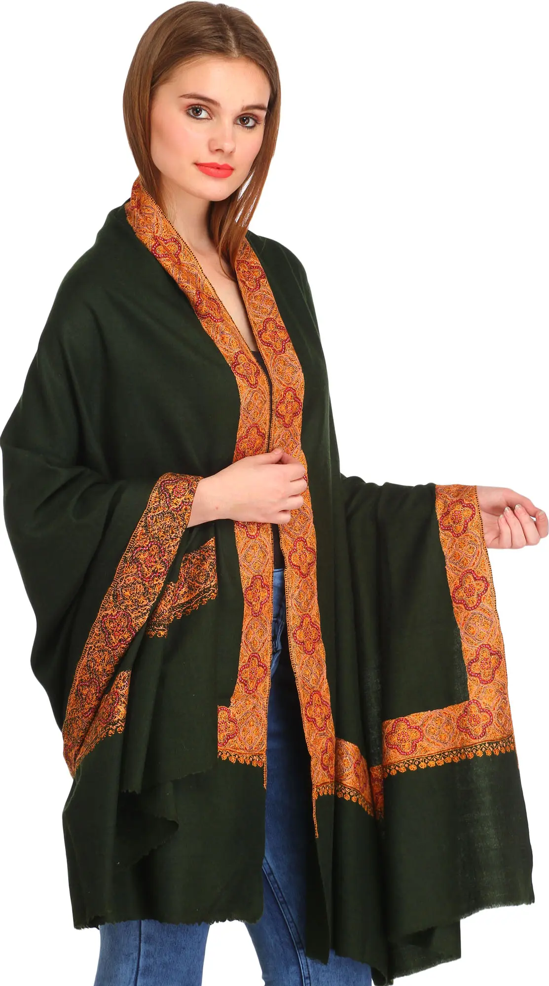 Aragon Plain Pure Pashmina Handloom Shawl from Kashmir with Intricate Sozni Embroidered Paisleys on Border